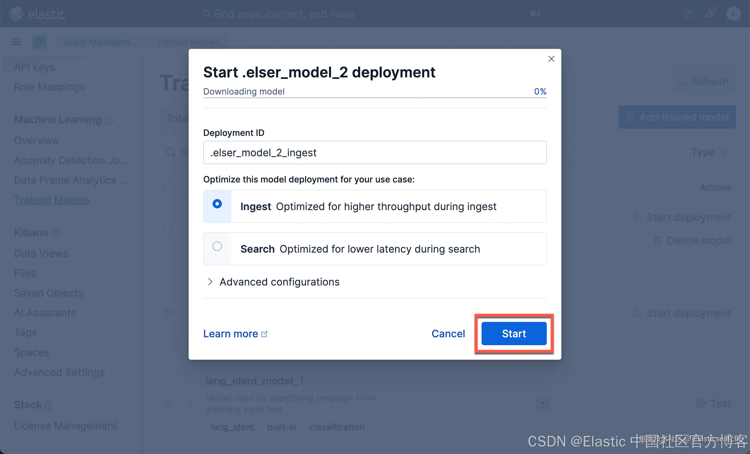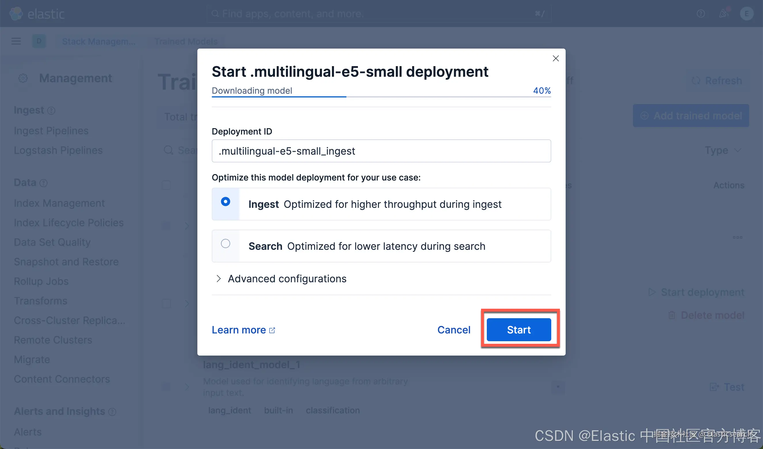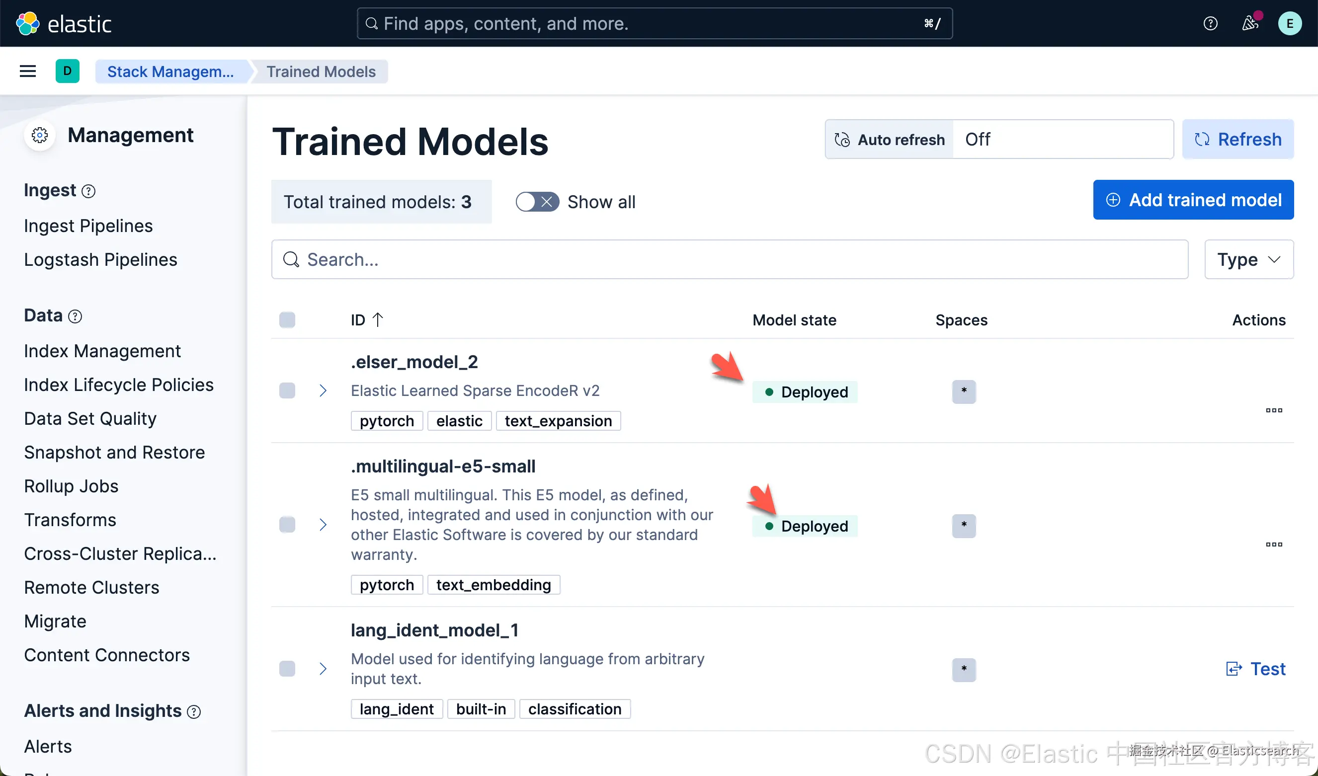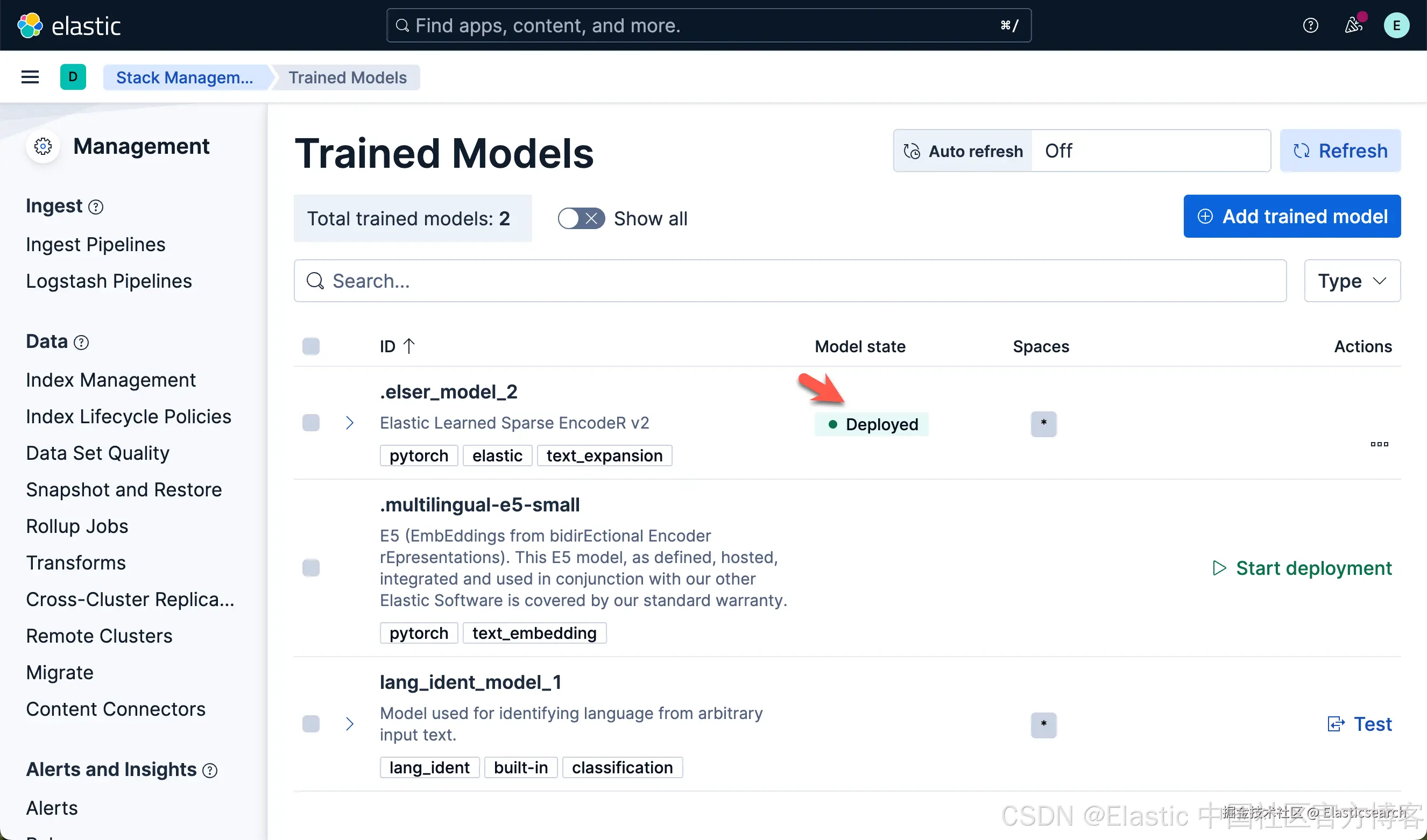 我们可以看到上面的两个模型都已经部署好了。如果你想部署其它的模型,可以参考文章 “Elasticsearch:如何部署 NLP:文本嵌入和向量搜索” 使用 eland 来上传模型。