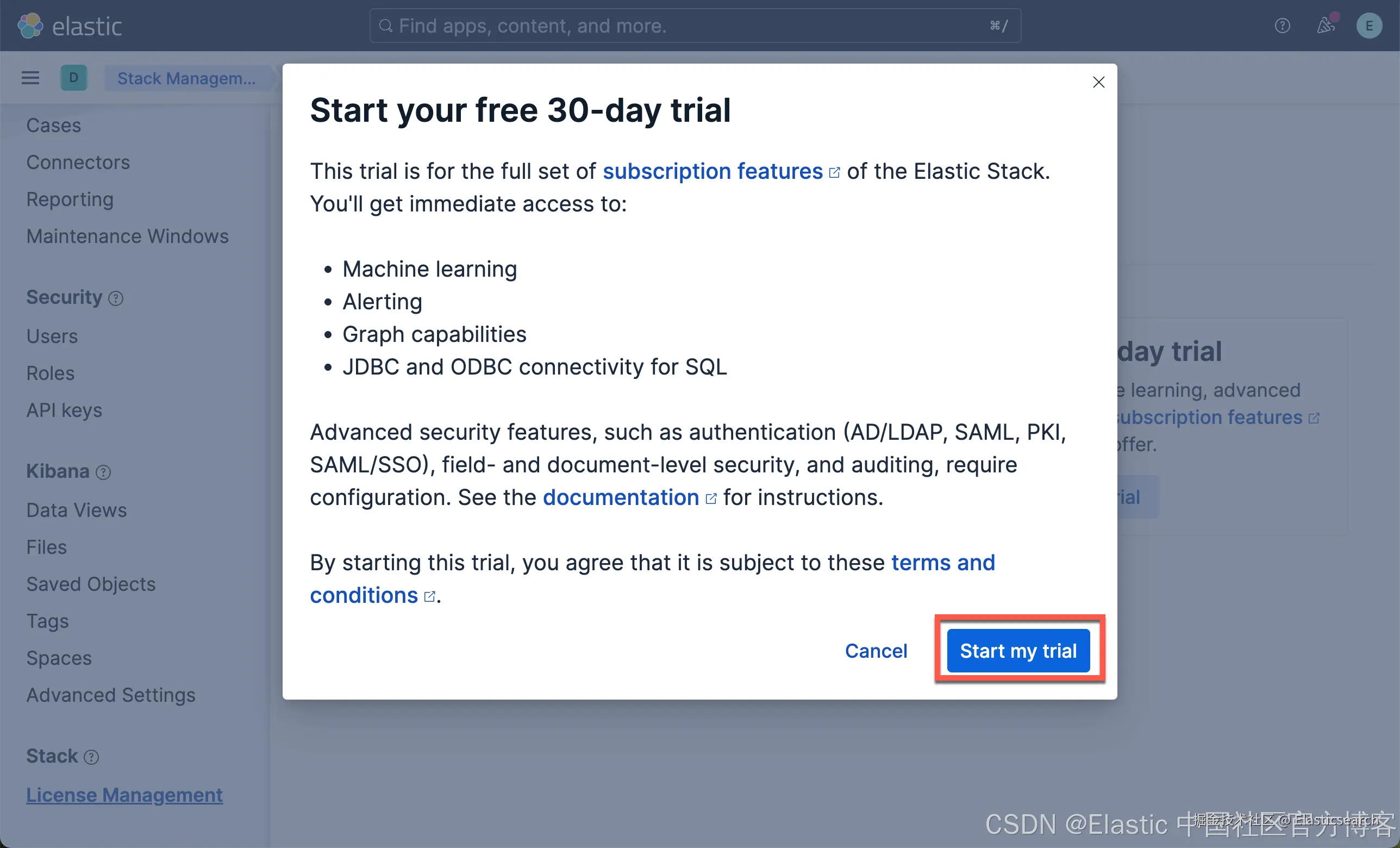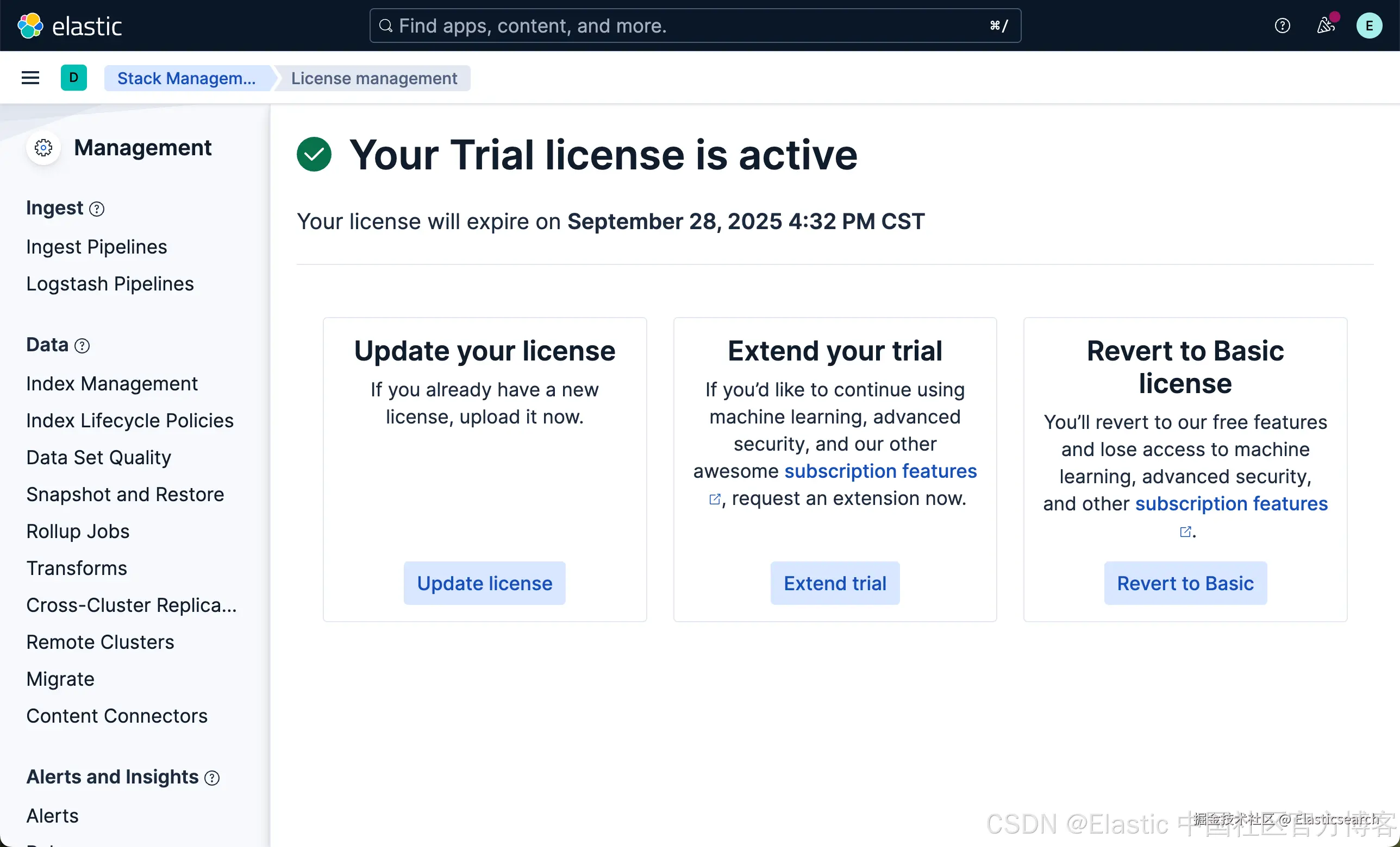 在我们如下的练习中,我们将下载 Elastic 自带的模型:ELSER(稀疏向量) 及 E5(密集向量)。由于这两个嵌入模型是安装在 Elasticsearch 的机器学习节点上的,我们需要启动白金试用。特别值得指出的是:如果你不使用 Elasticsearch 机器学习节点来向量化你的语料,那么你不必启动白金试用。你可以在 Python 代码里实现数据的向量化,或者使用第三方的端点来进行向量化,而只把 Elasticsearch 当做一个向量数据库来使用!
