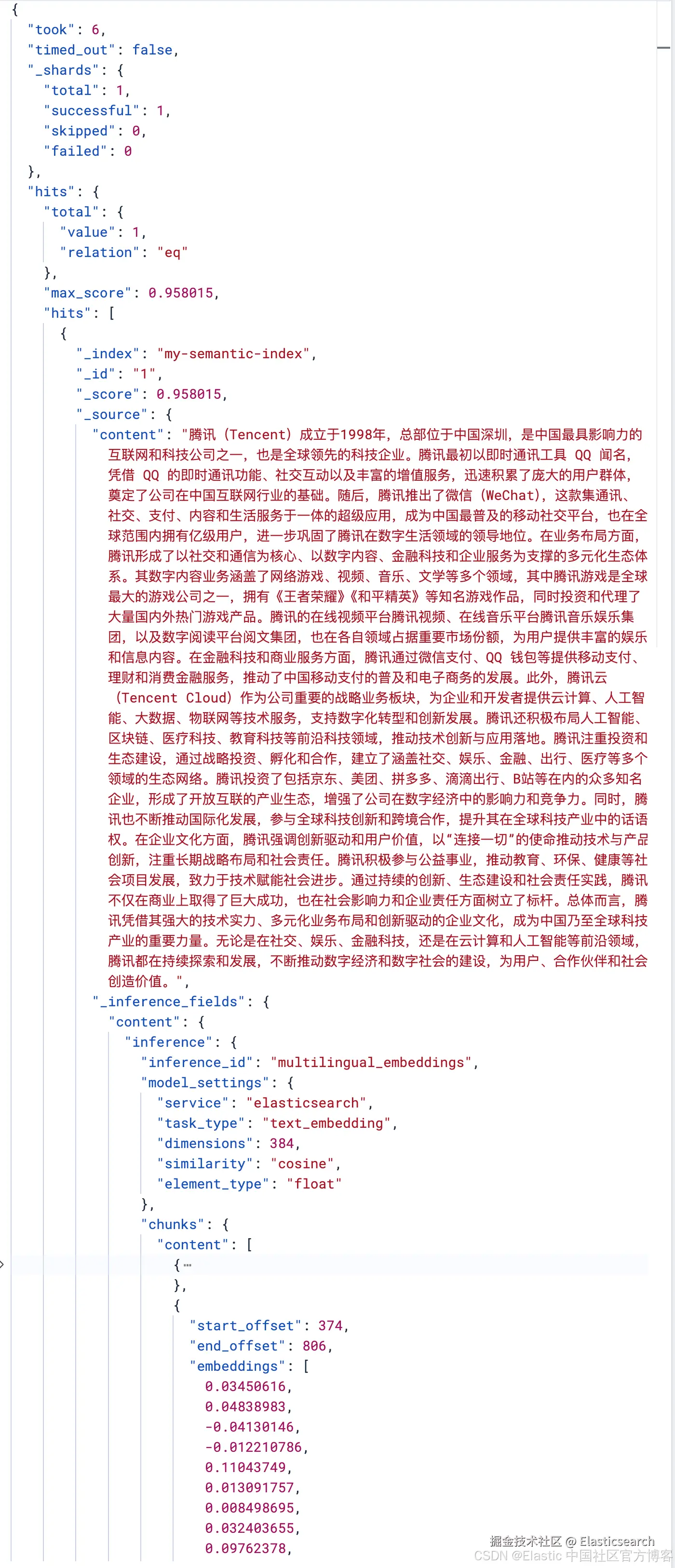 semantic_text 字段类型会使用推理端点自动为文本内容生成向量嵌入。长文本会自动被分块,以便处理更大规模的语料。它同时支持稀疏向量(sparse vector )及密集向量(dense vector)。它为我们的搜索带来极大的方便。我们无需知道这个字段是密集向量还是稀疏向量。对于它们的搜索,所有的查询语句都是一样的。