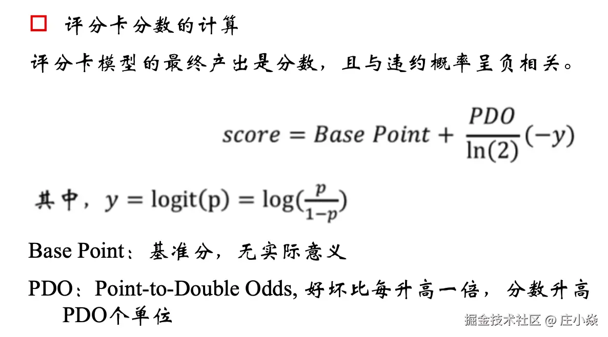 - 它的输出通常是一个 分数(Score) ,表示客户违约概率的大小。