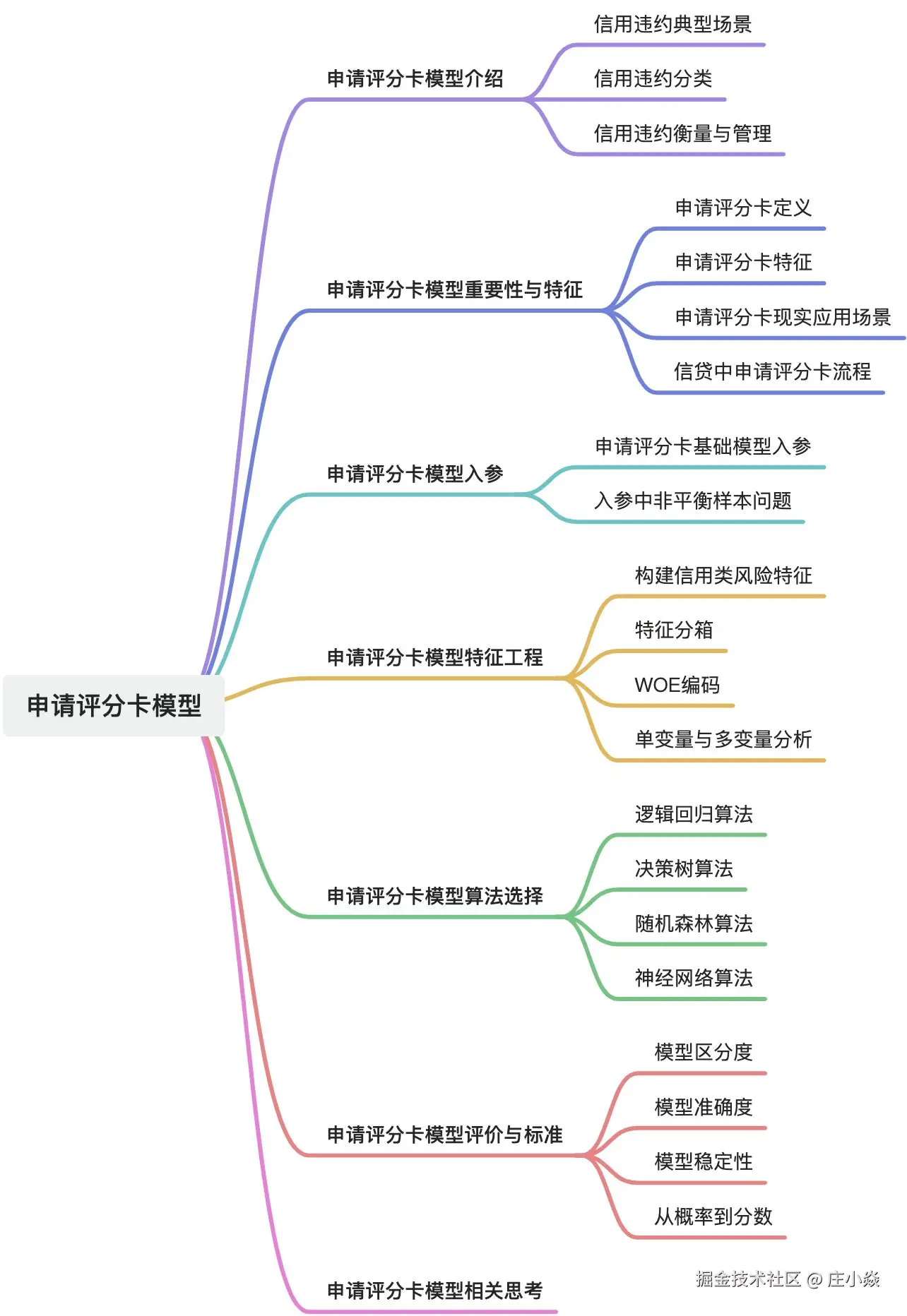 本文主要介绍了信贷模型域中的申请评分卡模型。首先阐述了信用违约风险的概念、典型场景、分类以及衡量与管理方法。接着详细介绍了申请评分卡的重要性、定义、特征、现实应用场景以及流程。然后深入探讨了申请评分卡模型的入参问题,包括非平衡样本问题。在特征工程方面,详细讲解了构建信用风险类型的特征、特征的分箱、WOE编码、特征信息度的计算以及单变量/多变量分析。在模型算法选择上,介绍了逻辑回归、决策树及其扩展、随机森林/GBDT/XGBoost、神经网络等常见算法。最后,阐述了申请评分卡模型的评价标准,包括模型的区分度、准确度、稳定性以及从概率到分数的转换,并对相关问题进行了思考。