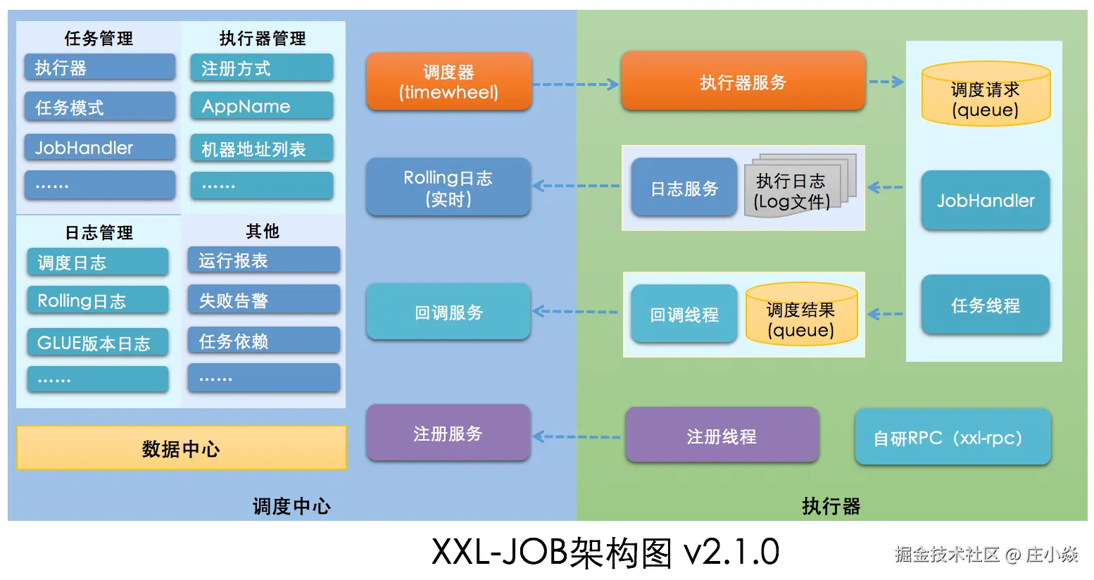 调度中心(Quartz 定时) → JobScheduleHelper → JobTriggerPoolHelper → XxlJobTrigger → HTTP 请求 → 执行器(XxlJobSpringExecutor) → @XxlJob 方法执行