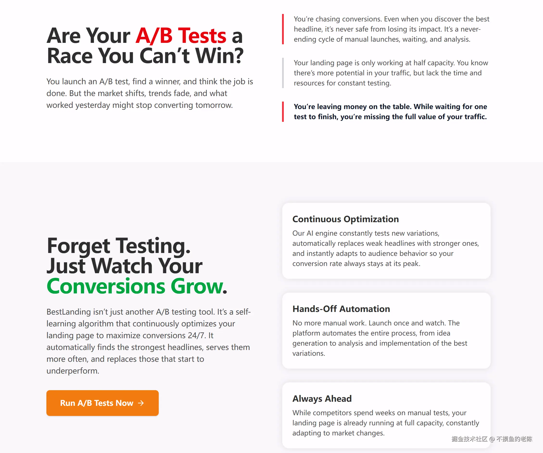 BestLanding是一款SEO优化工具,除了进行30+技术SEO检查外,还分析标题、描述和CTA,提供25个高转化率的hero section变体,帮助提升页面转化率。