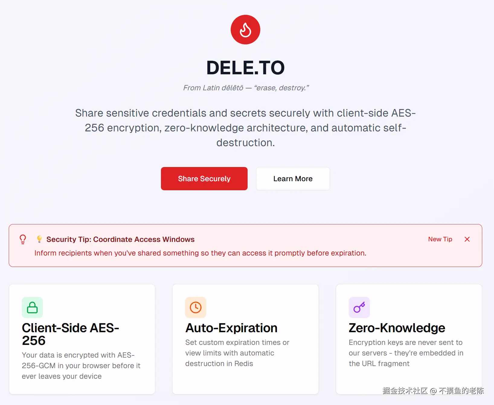 DELE是一款安全分享敏感数据的应用,可以设置链接过期时间和浏览次数,加密密钥不会触及服务器。