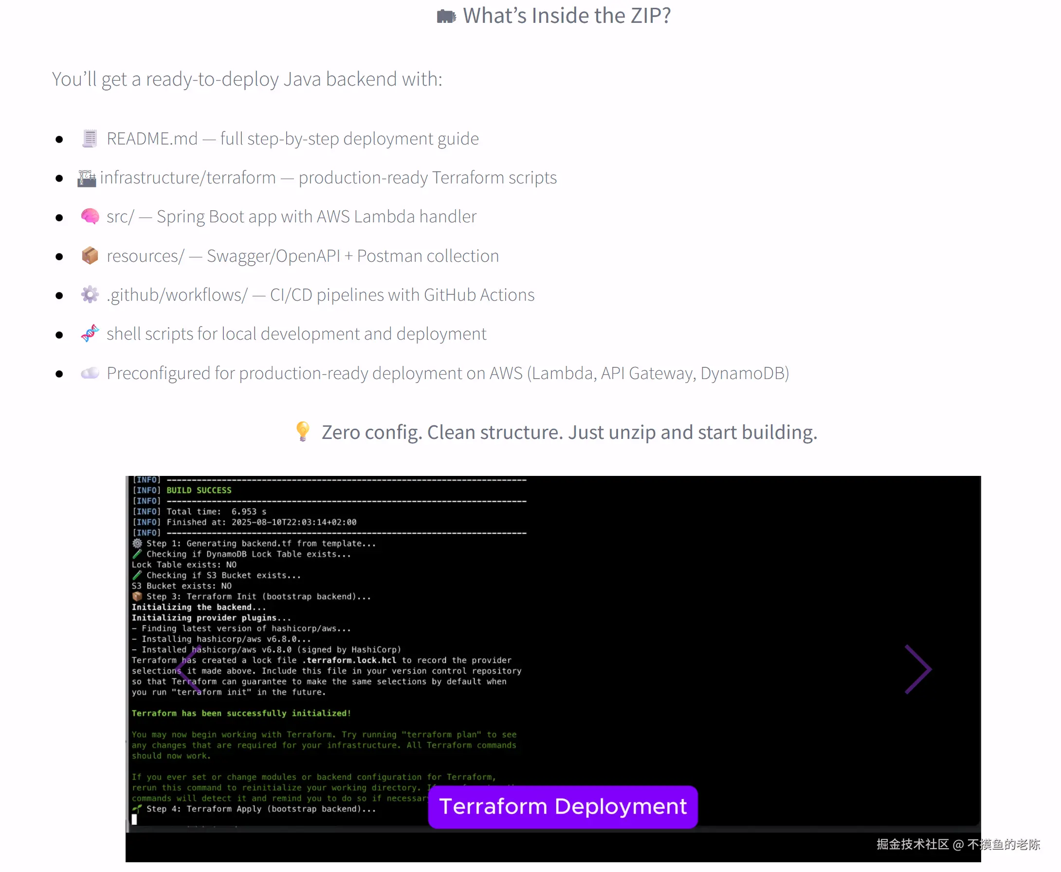 Template Hero是一款后端启动套件,集成了Spring Boot、AWS Lambda、DynamoDB、CI/CD和Terraform。