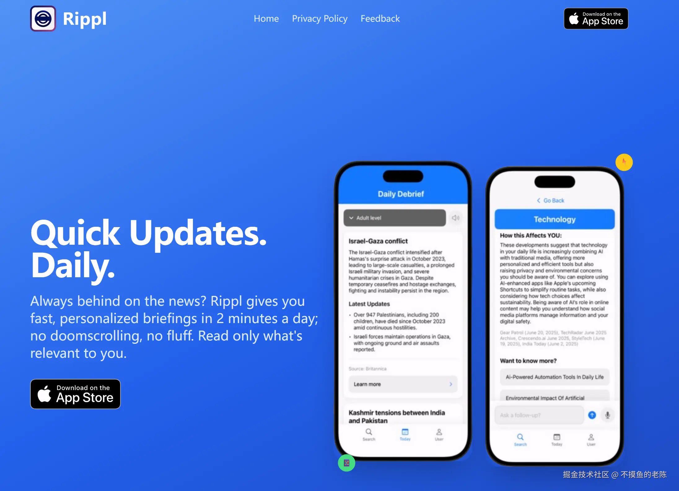 Rippl是一款免费的全球新闻App,能根据你的兴趣,快速提供每日新闻简报,并通过AI功能回答后续问题.