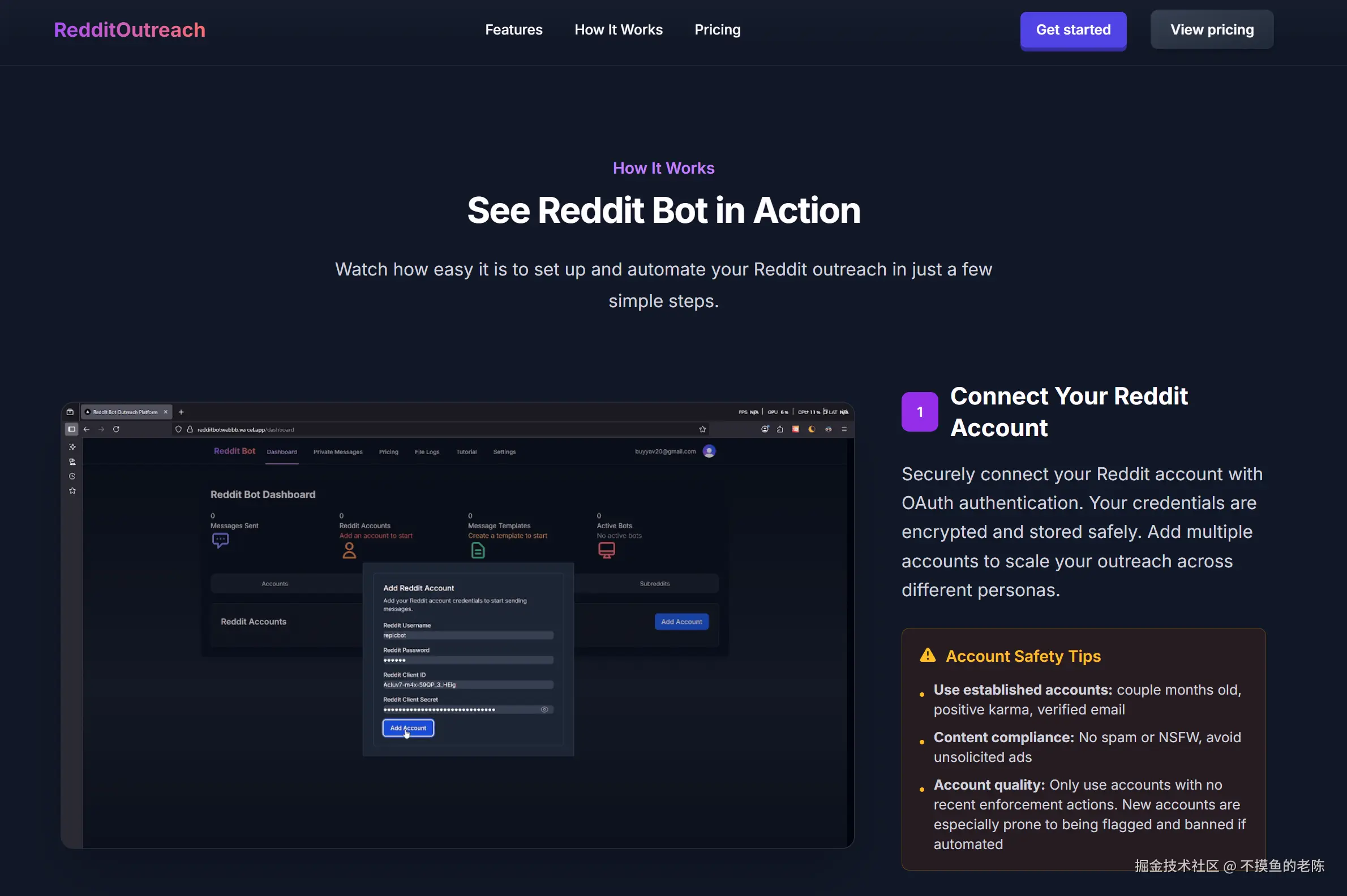 RedditOutreach 是一款自动化 Reddit 消息发送工具,支持多账户、AI 内容分析和实时分析,旨在帮助 SaaS 创始人和代理商高效发送个性化 DM。