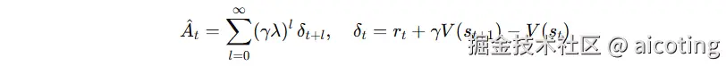 优势 At 衡量“该动作比平均策略好多少”。PPO 通常用 GAE(λ):