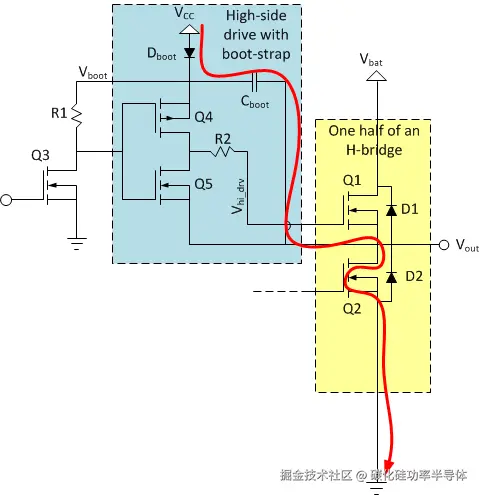 为了应对上管的驱动挑战,工程师们开发了多种解决方案,其中最常见且经济的是自举电路(Bootstrap circuit) 。自举电路利用一个二极管和一个电容(自举电容)来为高边驱动电路提供浮动电源。其工作原理是在下管导通时,自举电容被充电。随后,当需要驱动上管时,电容上存储的电荷被释放,为上管的栅极提供所需的驱动电压 。
