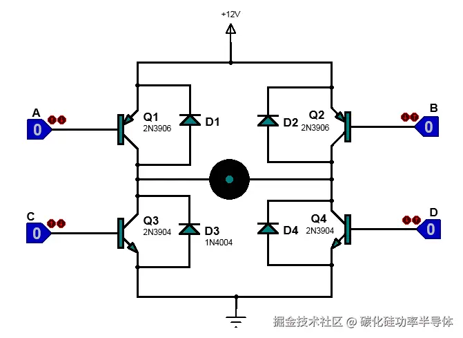 H桥,因其在电路图上形似字母“H”的结构而得名 ,是现代功率转换中最基础的拓扑之一。它由四个开关管(可以是继电器、BJT、MOSFET或IGBT)构成,用于控制施加于负载上的电压极性 。