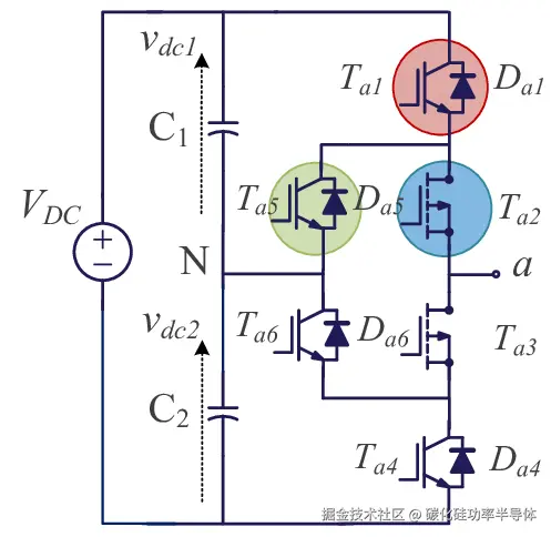 尽管SiC性能卓越,但其成本仍是传统硅器件的数倍 。为了平衡成本与性能,混合型ANPC(Hybrid-ANPC, H-ANPC)拓扑应运而生。这种方案利用了不同材料的优势,将SiC器件部署在承受高频开关损耗的桥臂上,而将成本更低的硅-IGBTs用于承受导通损耗的桥臂 。