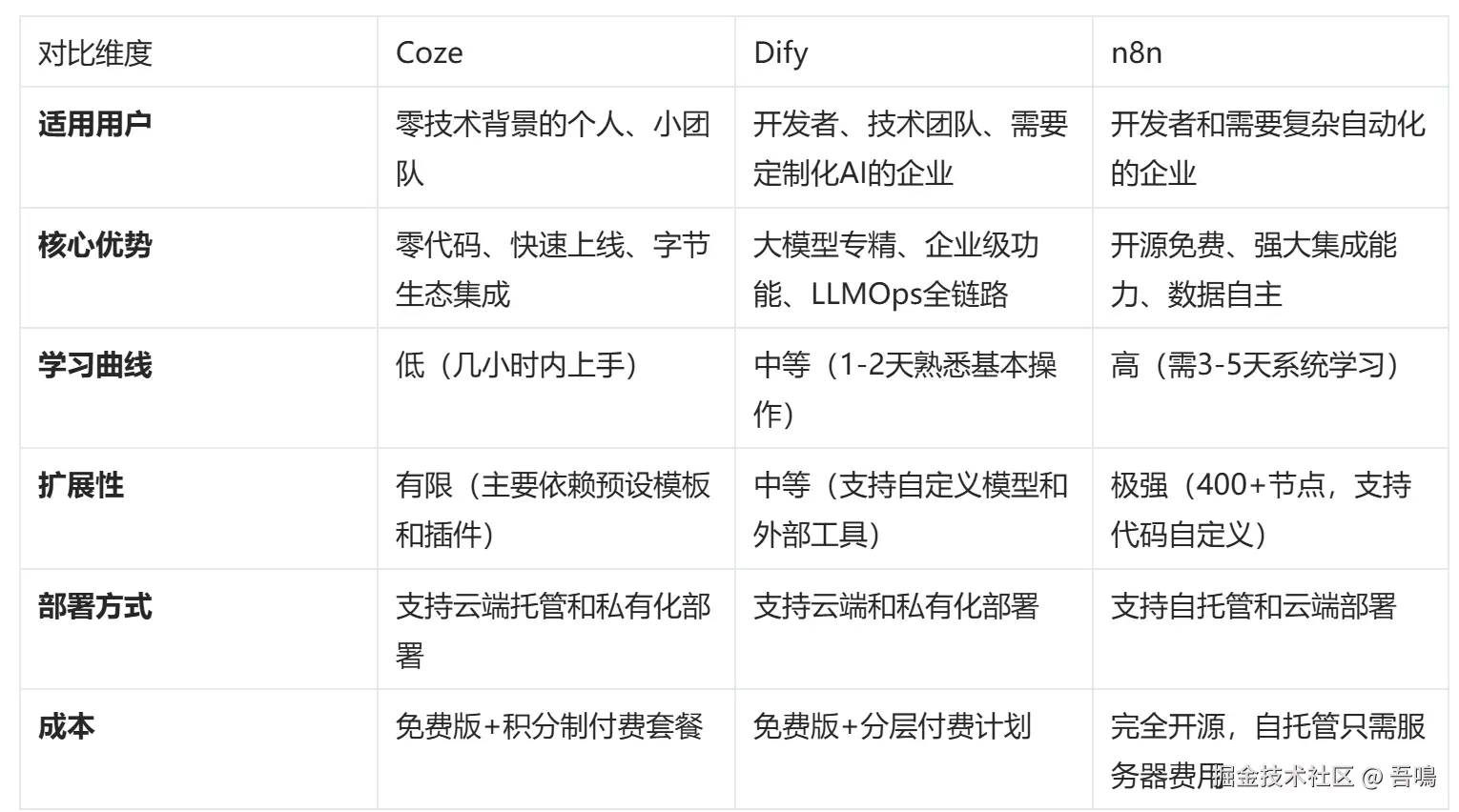 当前用户趋势显示,Coze因其零代码特性和个人免费策略,不错的用户使用体验,用户增长迅速。Dify则随着大模型应用的普及,在企业用户中的影响力不断扩大。n8n作为成熟的开源自动化工具,在企业级市场保持着稳定的用户基础。