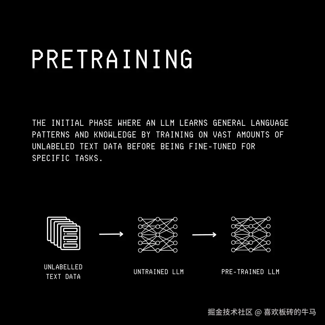 在这一阶段,LLM 通过处理大量无标签文本数据集来学习。