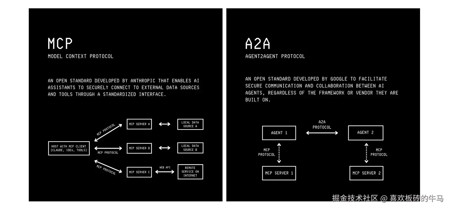 - 代理2代理(A2A)协议:该协议由谷歌开发并开源,可让多个独立的人工智能代理协作完成给定任务。