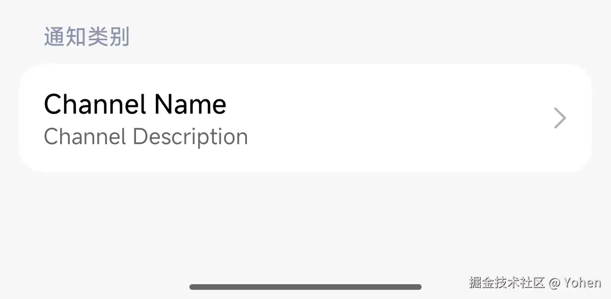 String description = "Channel Description";- 渠道的描述,用户在系统设置里可以看到,说明这个渠道里的通知是什么用途,同样建议放入资源以支持多语言。