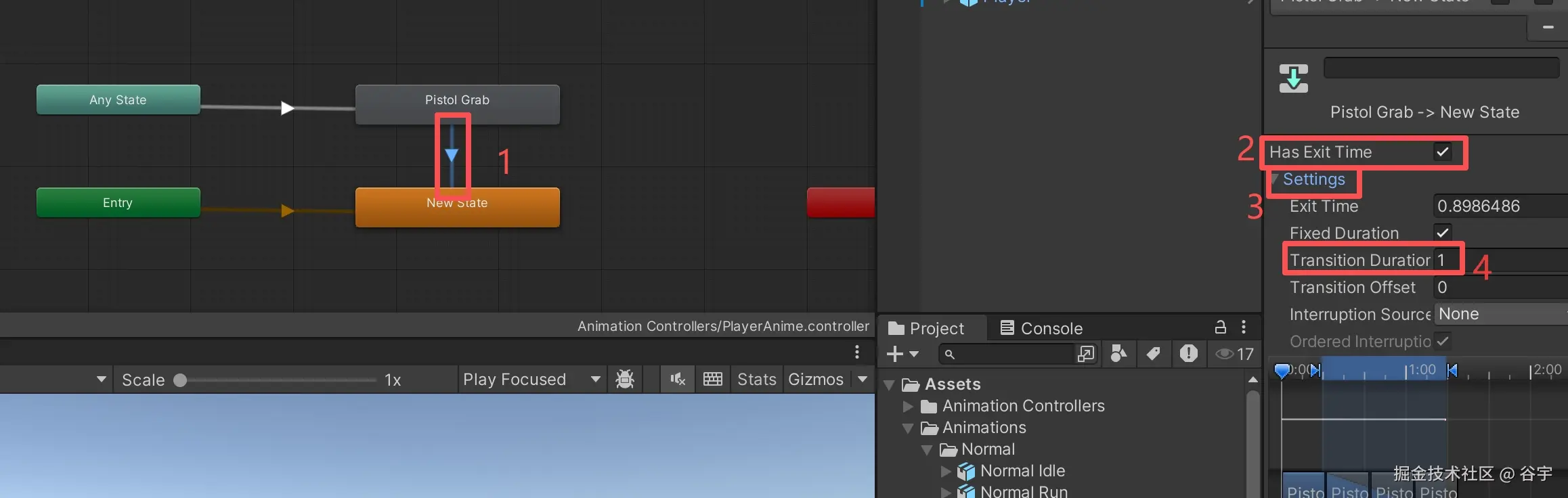 3.最后在“拔枪动画”和“空动画”之间创建一条过渡线,让拔枪后回到“空动画”循环播放,形成闭环。要注意这里的“Has Exit Time”需要勾上,因为需要等待拔枪动画完成后,再过渡。然后点击“Setting”,设置过渡时间为“1”秒,让拔枪动画更平滑过渡到空动画。