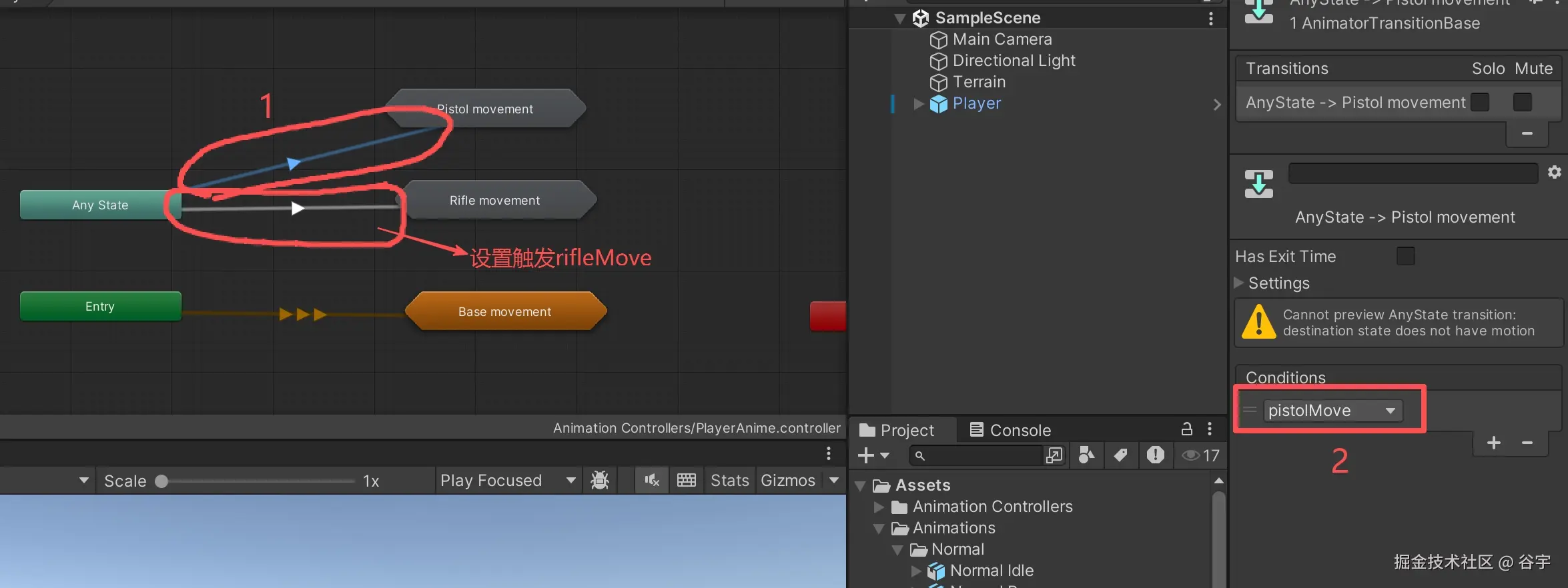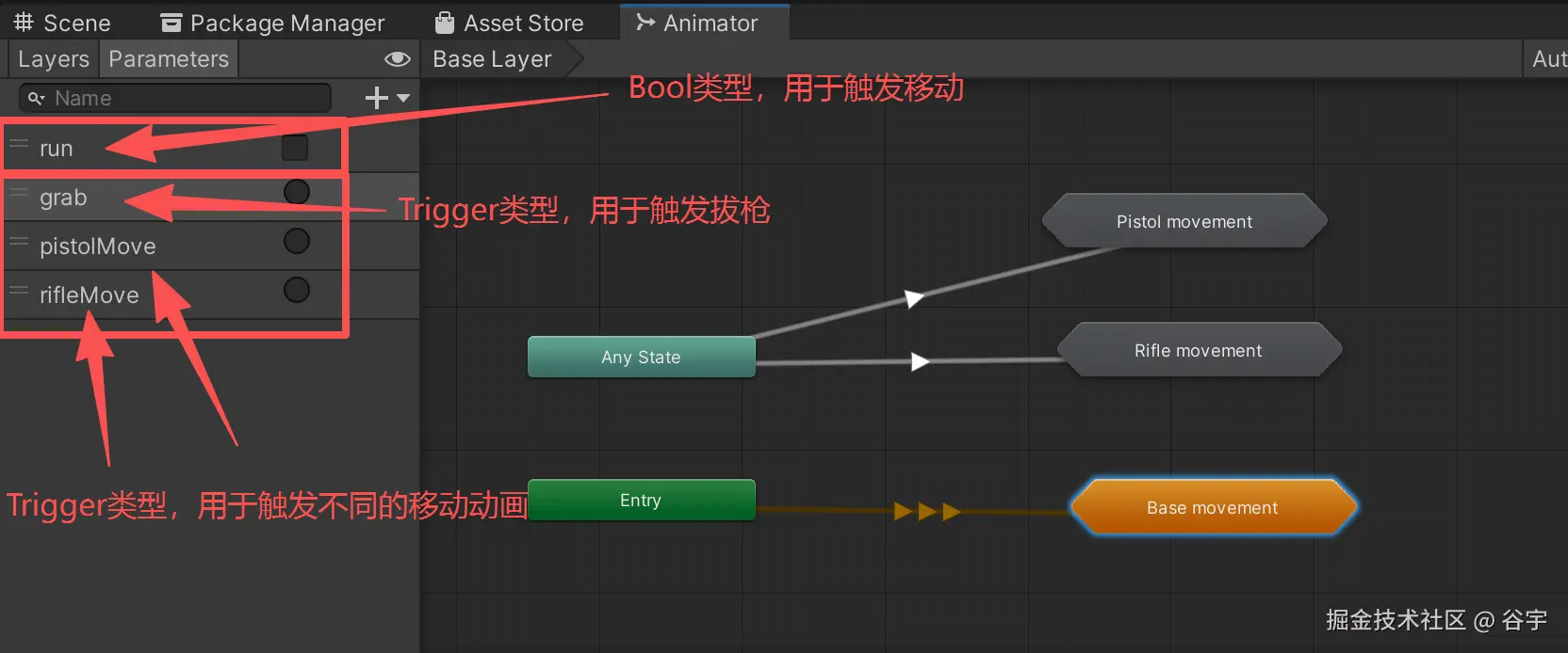 3.第三步点击选中“Any State”和“Pistol Movement”之间的过渡线,设置触发变量为Triggle类型的“pistolMove”。然后再选中“Any State”和“Rifle Movement”之间的过渡线,设置触发变量为“rifleMove”。