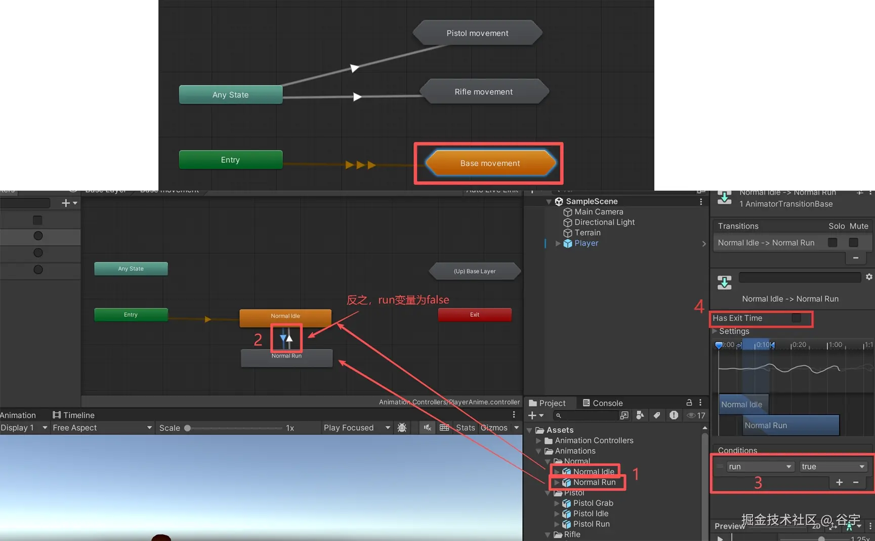 4.第四步双击打开子动画机“Base Movement”,接着把角色的普通站立动画和移动动画拖拉到子动画机上。为站立和移动动画创建过渡线,并设置触发变量“Run”(“站立”过渡到“移动”,变量“Run”为true,反之变量“Run”为false)。最后去掉“Has Exit Time”的勾选,因为移动需要实时进行。