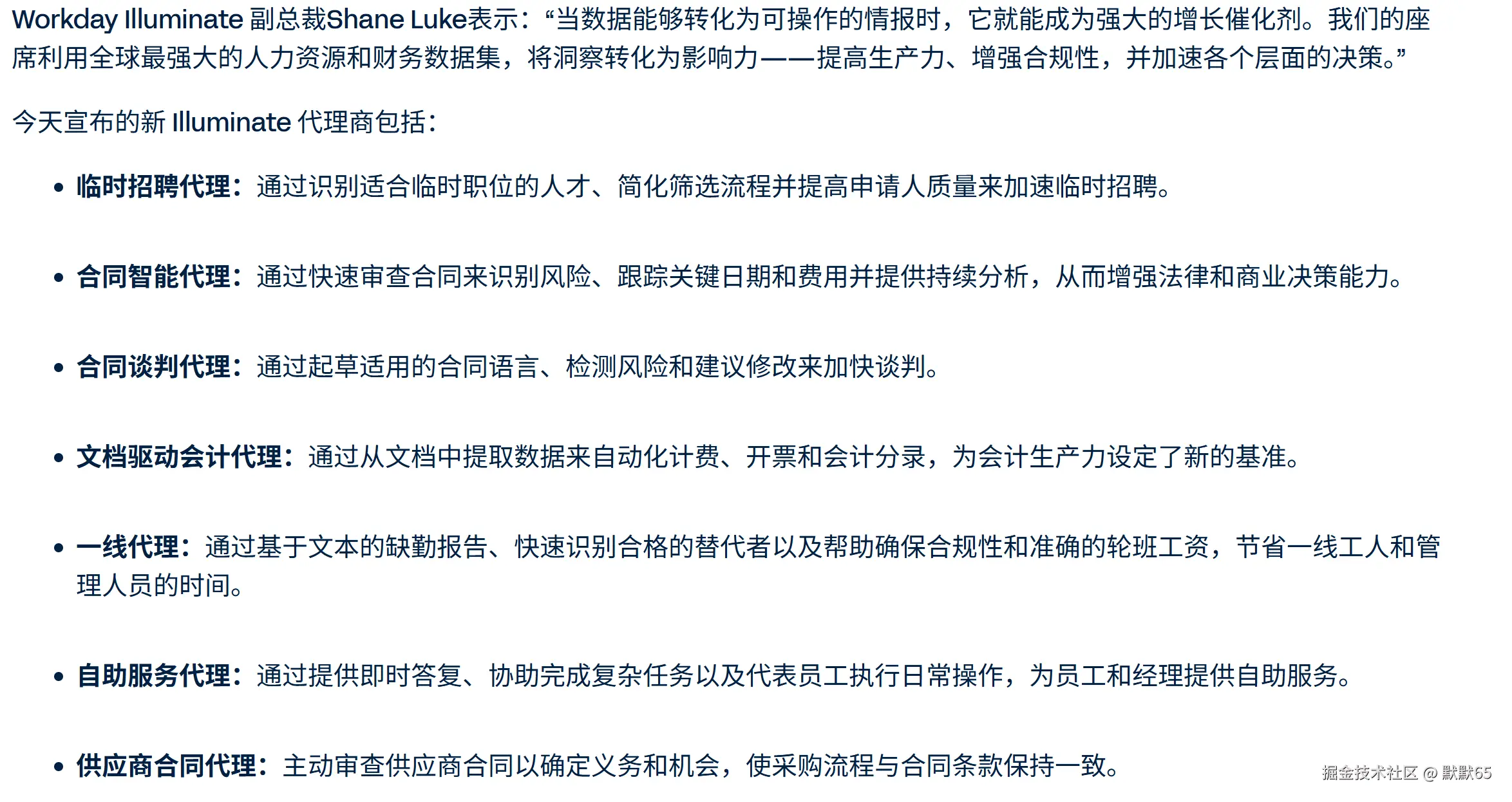 - Illuminate AI Agents 2024 年,Workday 推出了多款 AI Agents,覆盖招聘、费用报销、继任计划等场景。AI 不仅能执行任务,还能跨模块协作。例如,一个报销 Agent 能自动校验费用合规性,再把结果交给审批流程,大幅减少人工操作。