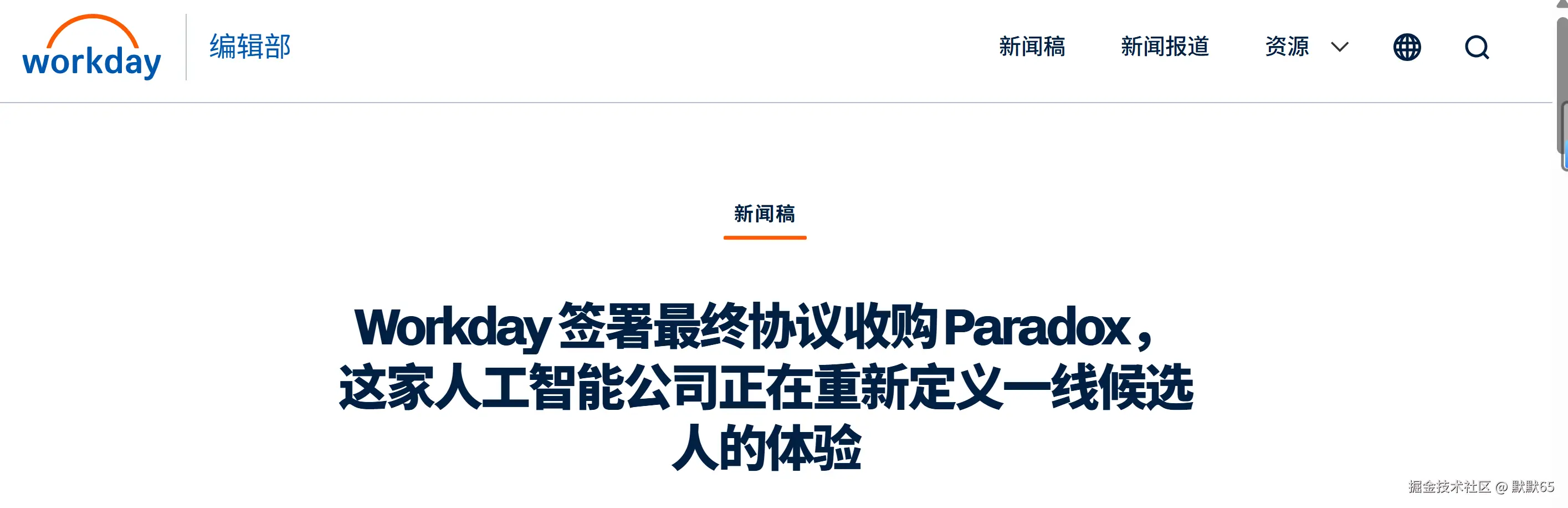 - 收购 Paradox 2025 年 8 月21日,Workday 宣布收购对话式 AI 招聘平台 Paradox。这意味着招聘环节将出现一个 7×24 小时的 AI 助手,能够自动回复候选人问题、安排面试、收集反馈。数据显示,Paradox 已经支撑了超过 1.8 亿次对话,候选人转化率大幅提升。