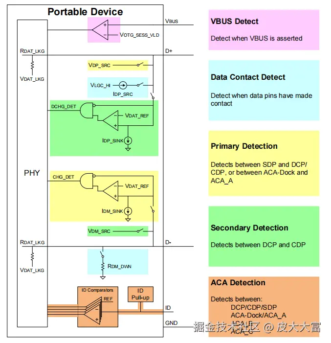 这个阶段不是必须的,因为USB端口可能支持数据协议也可能不支持。DP上有150mV(=1uA x 15k欧姆下拉电阻)的电压,DM上电压为0,这是一个硬件检测模块,用于帮助检测USB数据线与另外一端引脚的接触情况。端口如果不支持这个DCD阶段,就会在PD在attach event之后最大900ms内没检测到D+或ID PIN的连接,则会要求PD必须开始Primary Detection。如果PD支持这个DCD阶段,则能尽快检测数据线的连接,而后进行Primary Detection,无需等待超时的到来。