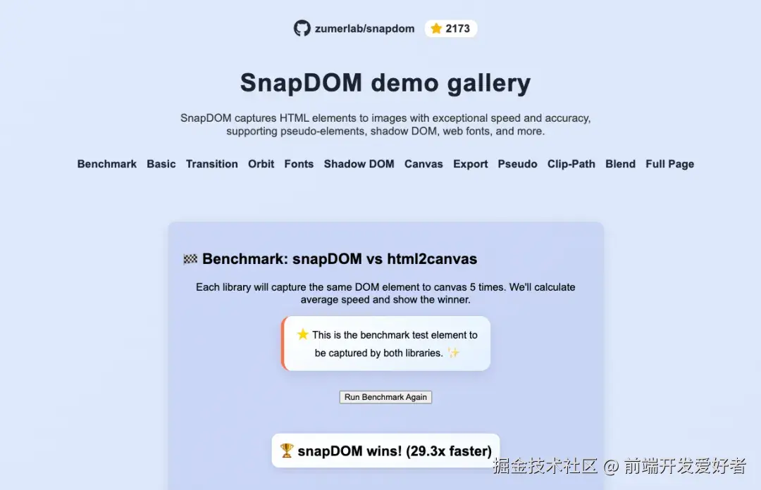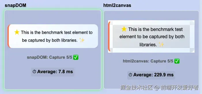测试数据显示,在不同场景下,SnapDOM 都把 html2canvas 和 dom-to-image 这俩老前辈远远甩在身后。