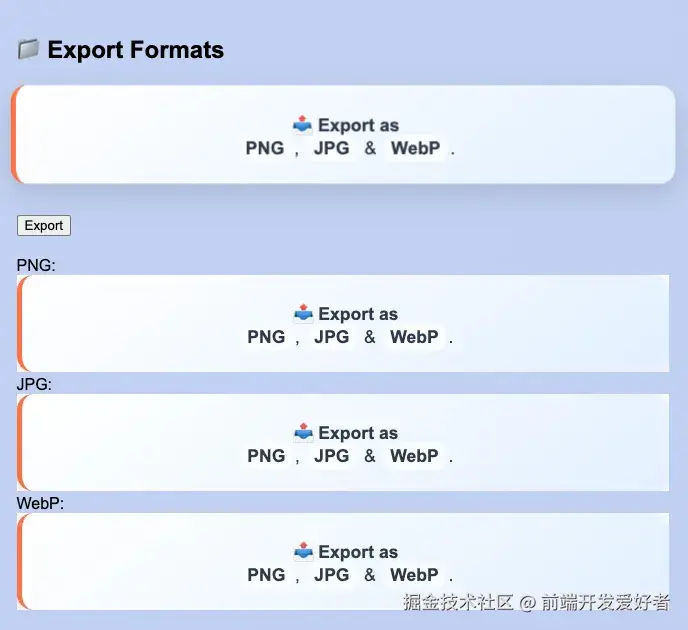 不管你是想要矢量图 SVG,还是常用的 PNG、JPG,或者现代化的 WebP,又或者是需要进一步处理的 Canvas 元素,SnapDOM 都能满足你。