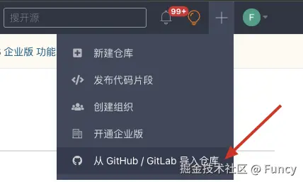 登录个人的gitee,点击“+”号,选择“从github/gitlab导入仓库”: