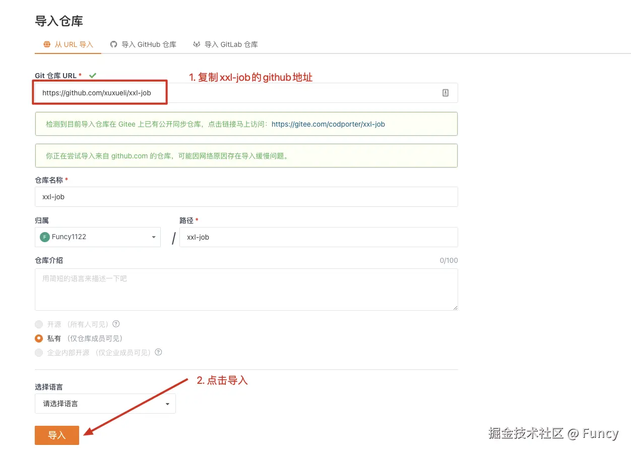 既然是源码分析,当然要先获取源码了,xxl-job的github地址为https://github.com/xuxueli/xxl-job。一般来说,直接frok这个仓库就可以了,不过由于国内网络的原因,github 的访问并不稳定,比如checkout到一半网络断开、push超时等。为了规避这些问题,建议使用国内的git仓库——gitee,操作方式如下: