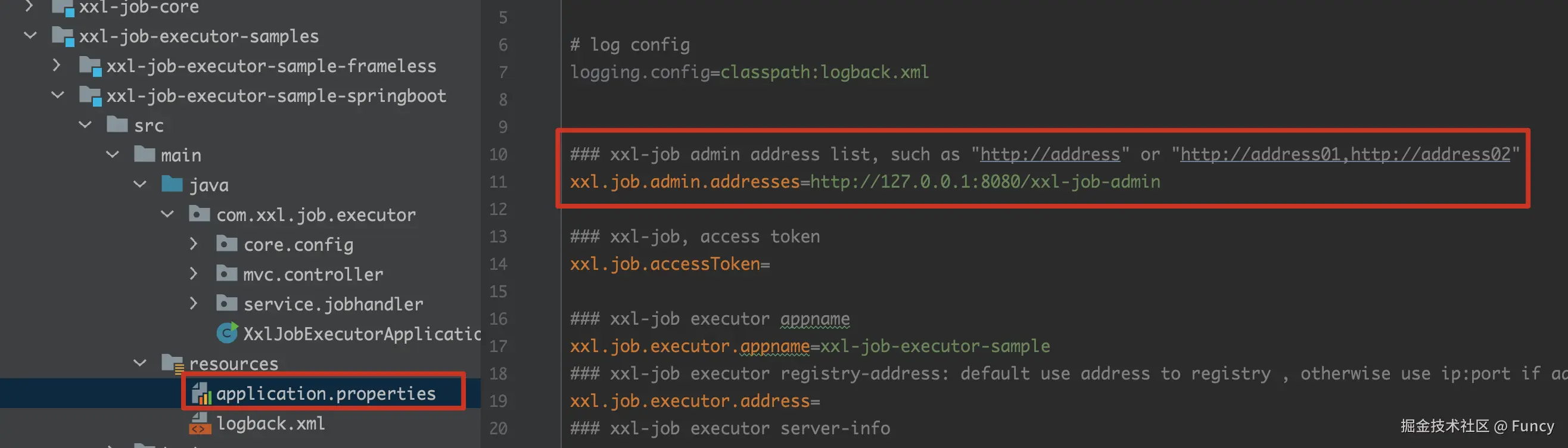 在启动xxl-job-executor-sample-springboot前,要先配置xxl-job-admin项目的地址,配置文件为application.properties: