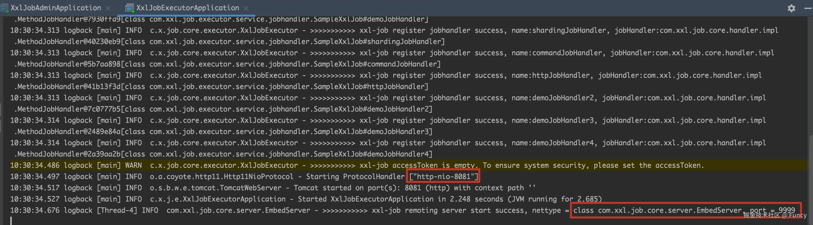 配置好admin地址后,启动即可,启动类为com.xxl.job.executor.XxlJobExecutorApplication,控制台日志如下: