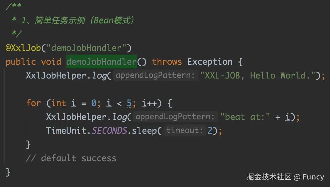 该任务的代码位于xxl-job-executor-sample-springboot模块的com.xxl.job.executor.service.jobhandler.SampleXxlJob#demoJobHandler方法,代码如下: