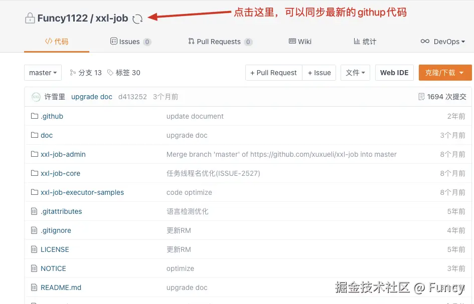 等待一会,就得到了自己的xxl-job的gitee地址了,本人得到的地址为https://gitee.com/funcy/xxl-job,并且gitee上也提供一个按钮,可以很方便地同步github上的代码: