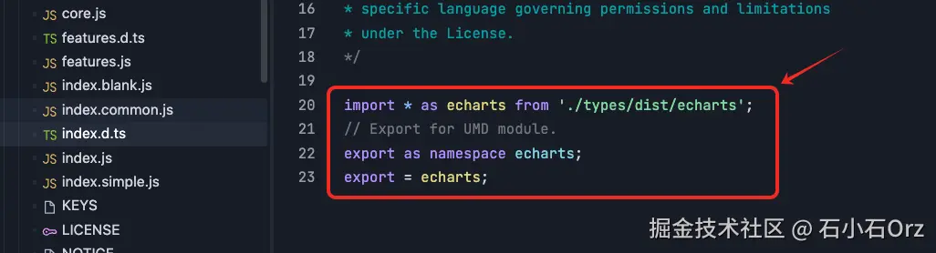 这是为了兼容 UMD 模块,即在浏览器通过<script>直接引入时,可以挂载到全局变量window.echarts上。这样我们在代码里就能直接写: