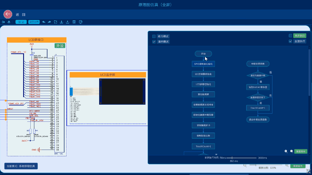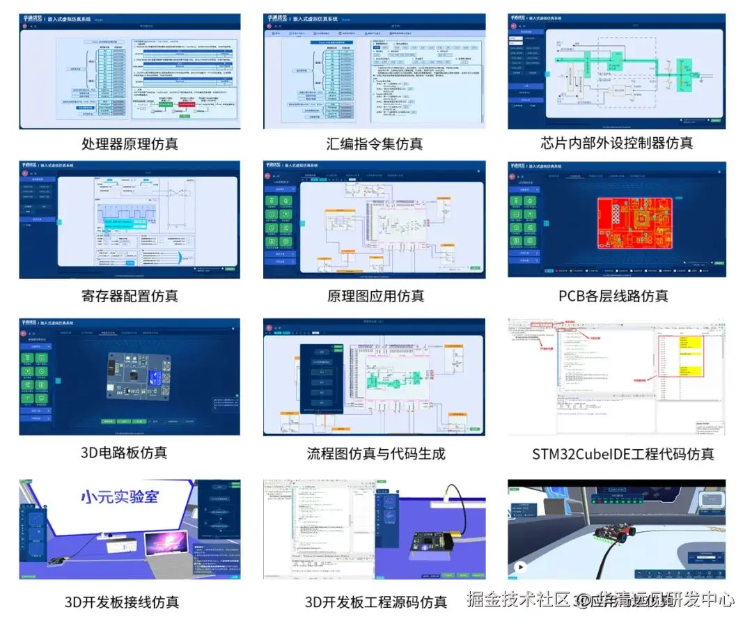 嵌入式虚拟仿真系统根据这个学习痛点,设计了全流程的仿真,搭建了完整的知识体系,涵盖了从3D电子元器件属性介绍,到芯片外设控制器工作原理与寄存器配置,再到原理图设计及连线仿真,以及PCB各层线路仿真、PCB 3D效果展示、流程图编程仿真,包括STM32CubeMX HAL库源码仿真,直至项目3D场景仿真(如智能灯光控制系统、智能大棚温控系统、火灾报警系统、智能小车)的全流程仿真。
