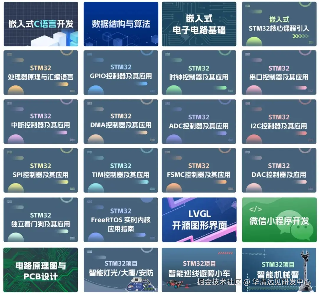 优质的教学平台需配套完善的课程体系,华清远见打造600余讲、总时长超200小时的嵌入式全栈课程,与虚拟仿真平台形成 “学 - 练 - 测” 闭环。课程覆盖电子电路基础、嵌入式C语言、数据结构、STM32处理器开发、FreeRTOS操作系统、物联网应用等核心内容,从零基础到项目实战层层递进,满足高校不同年级、不同基础学生的学习需求,教师结合本校教学特点进行定制化开发,大幅缩短课程建设周期。