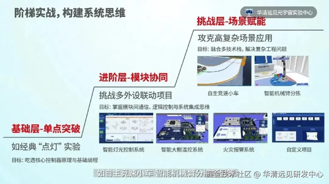 平台搭建的 “基础层 - 进阶层 - 挑战层” 三级实战体系,以 虚实结合、产业导向、项目驱动为核心,完全契合高校循序渐进培养产业适配型人才的教学逻辑。