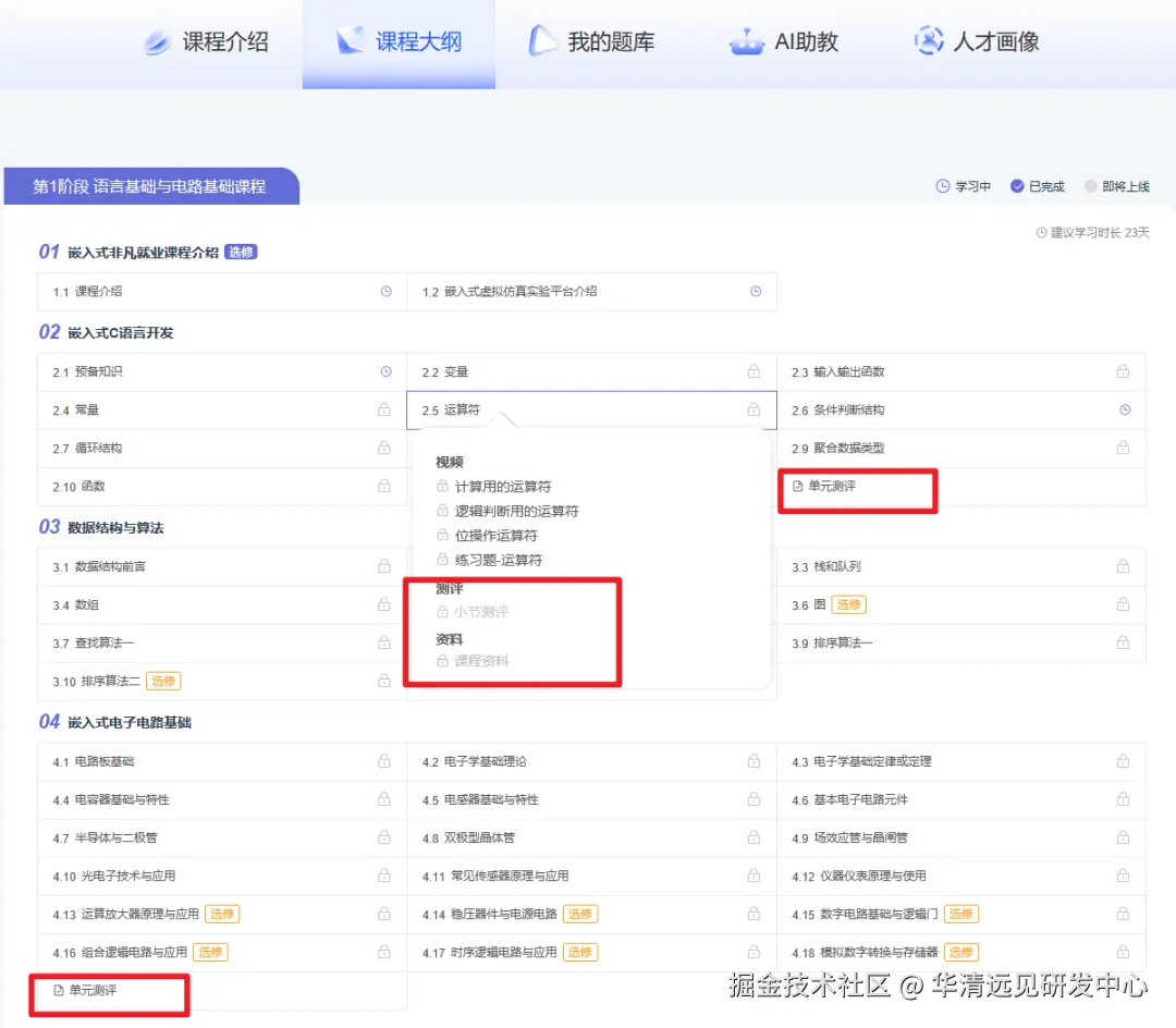 课程每个阶段都提供章节小测,完成测试后可即时查看错题解析与知识点溯源,教师则能通过测试结果掌握学生薄弱环节,针对性调整教学节奏;这种 “学 - 练 - 测” 闭环设计,既帮助学生及时查漏补缺,又为高校把控教学质量提供数据支撑,进一步提升嵌入式教学的精准性与有效性。