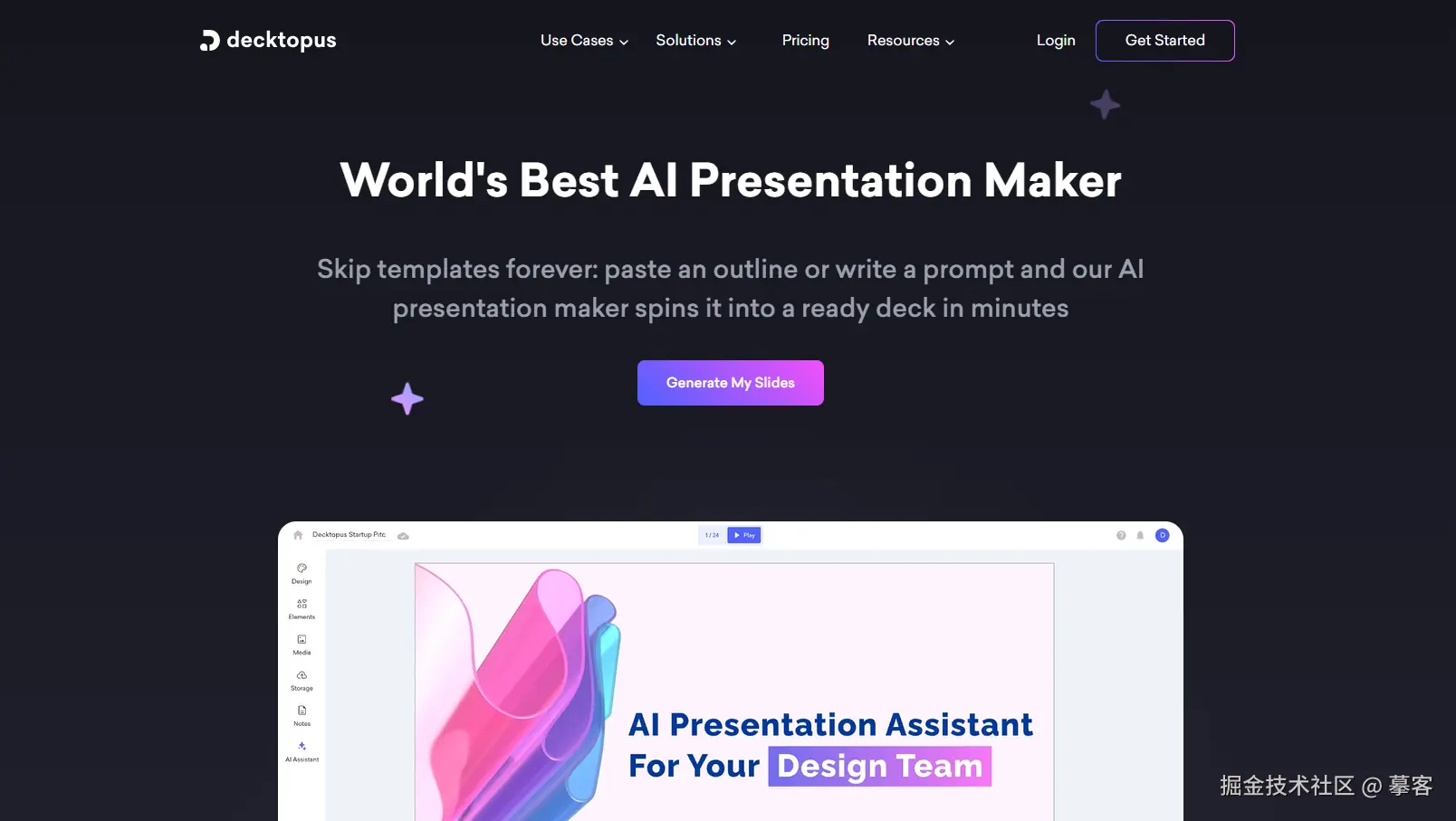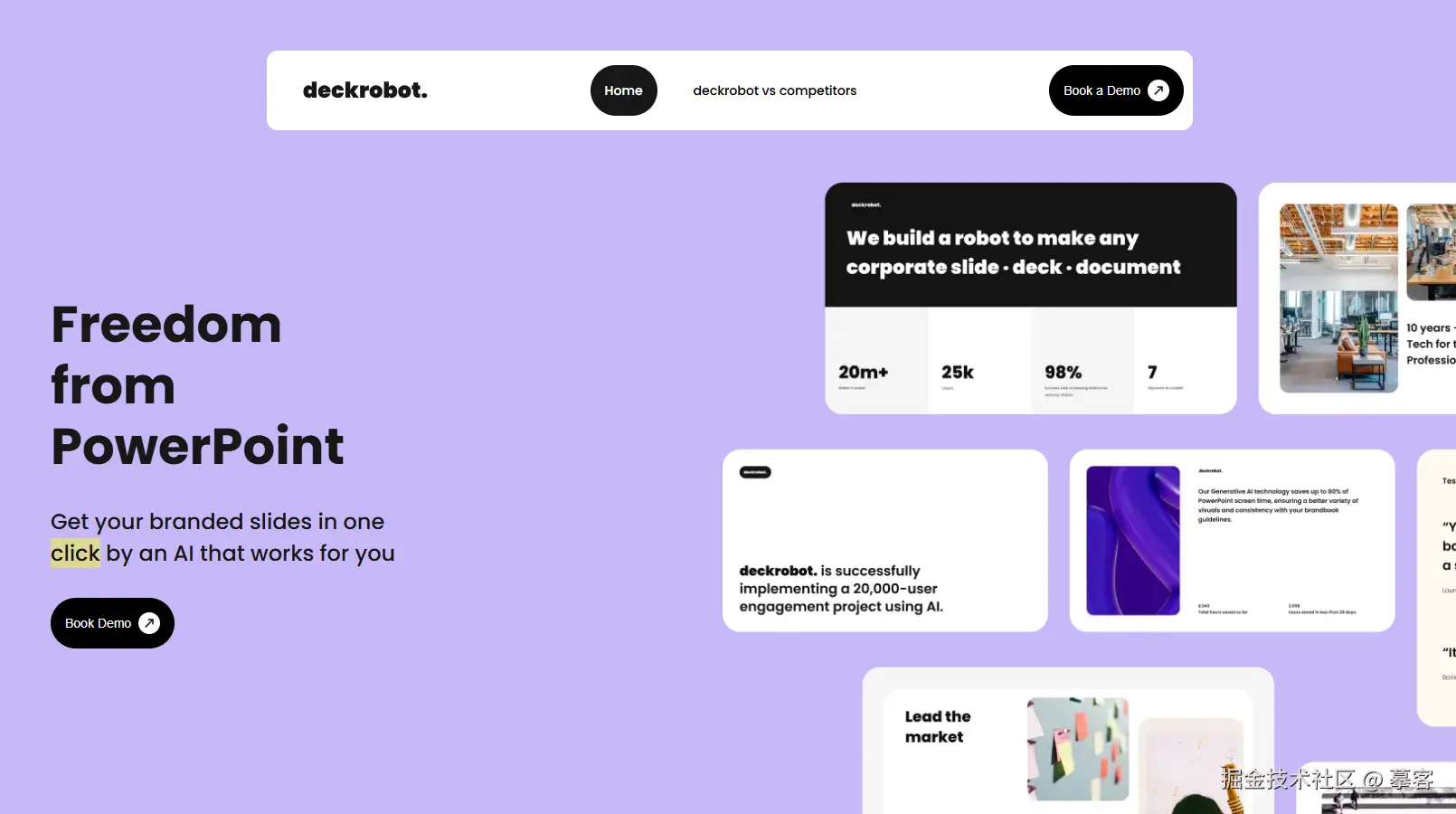 DeckRobot 是一款专注企业级PPT自动化的工具,兼容PowerPoint,能够自动排版、优化图表和统一风格。它特别适合需要批量生成幻灯片的职场团队,节省重复性设计时间,同时保证演示文稿的专业一致性。