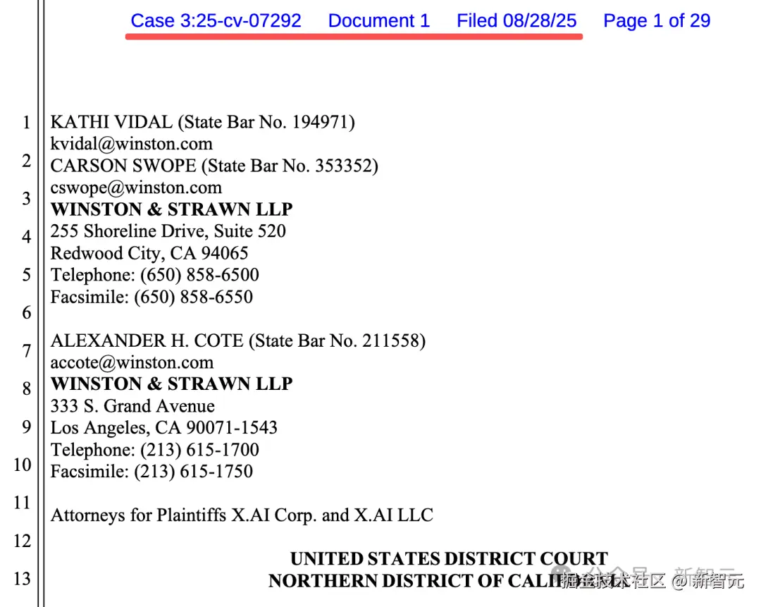 于是在 8 月 28 日,xAI 正式对 Xuechen Li 提起诉讼,案件编号为 3:25-cv-07292。