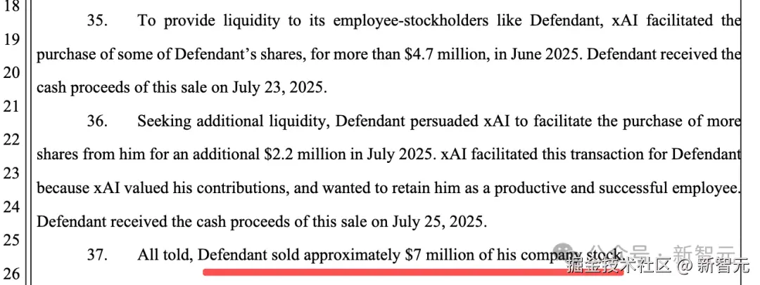 xAI 称,为了向 Li 这样的员工股东提供流动性,xAI 于 2025 年 6 月协助购买了被告的部分股份,金额超过 470 万美元。
