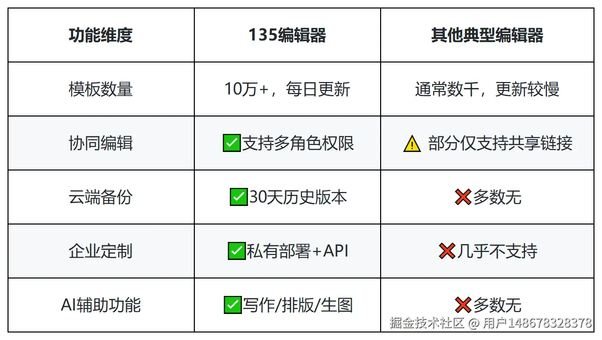三、深度对比:135编辑器 vs 其他主流工具
