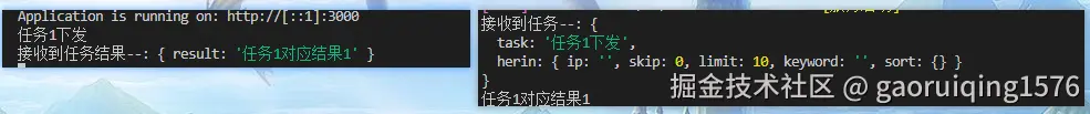 注意,我这边起了两个服务,一个发任务,接收结果,另一个接收任务,发送结果,自行修改对应的key和queue就行,最终测试结果如下:
