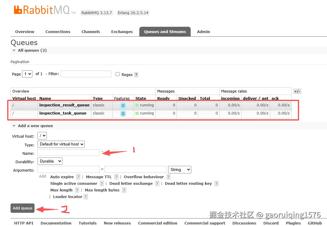 5.接下来创建队列 ,我这边创建一个发布任务 一个返回结果的队列