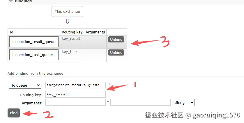 6.将队列与对应的key进行绑定,进入交换机,绑定好后,自动在3处显示