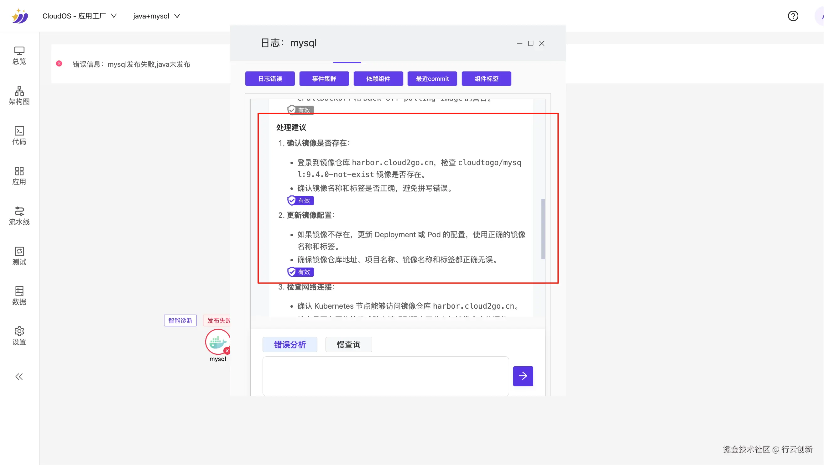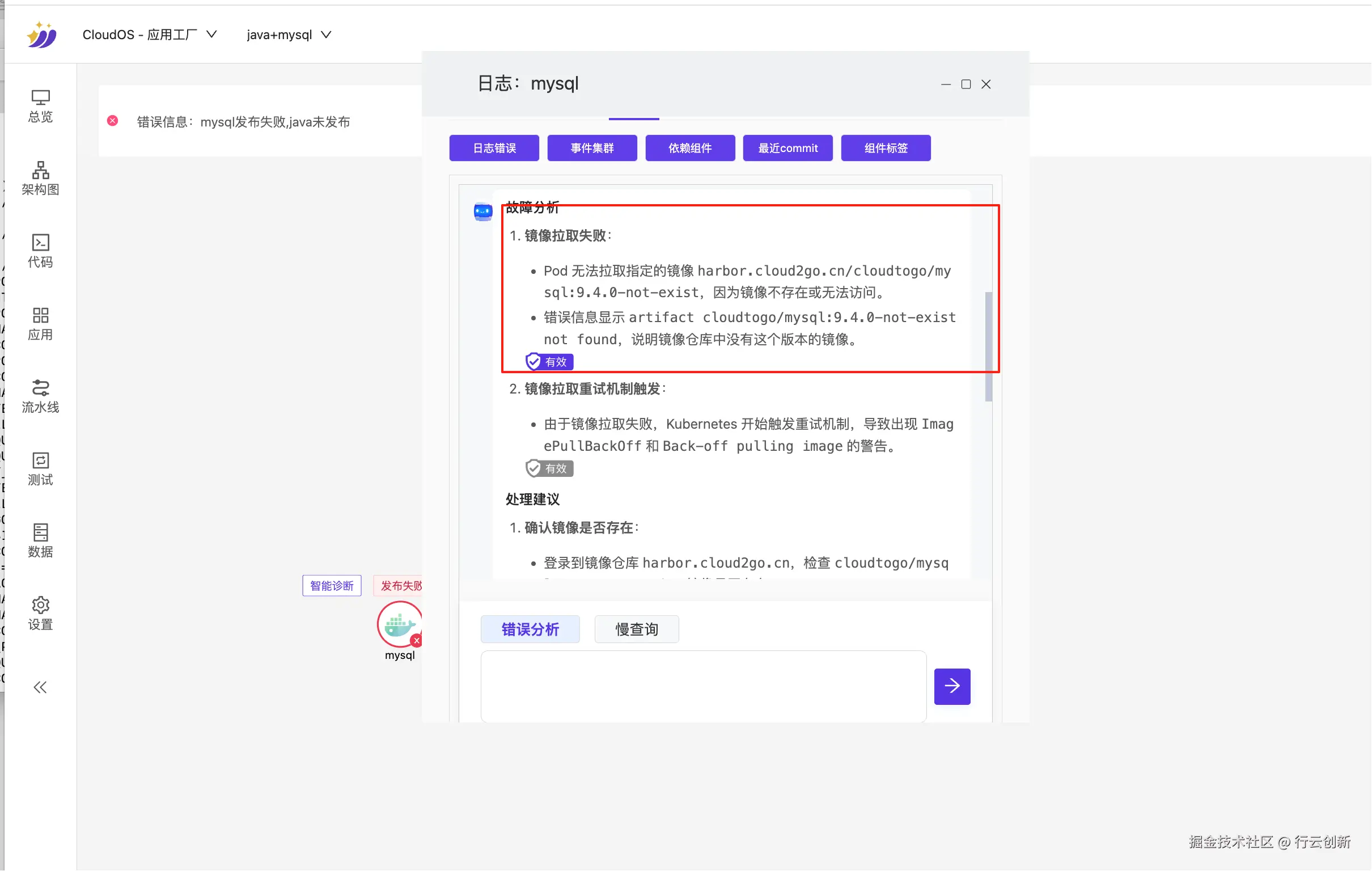 2. 从下图可见,智能体已准确识别故障原因 —— 镜像仓库中不存在该指定镜像。