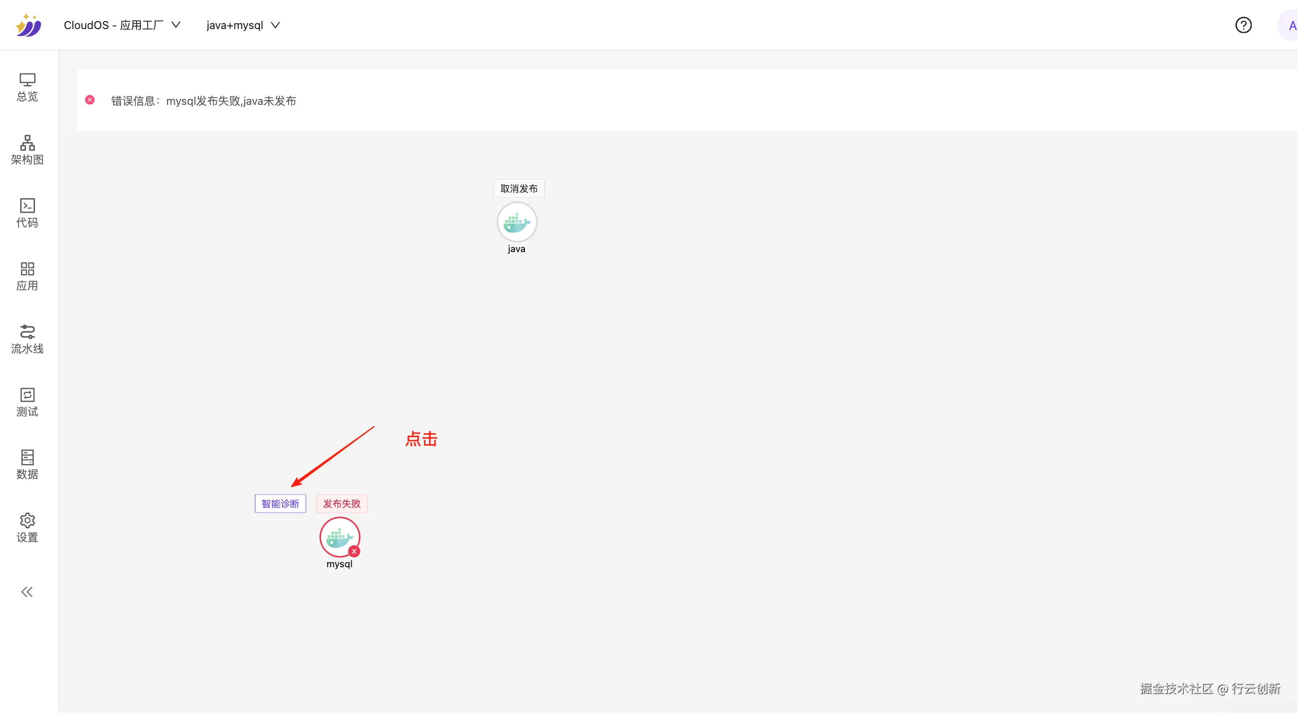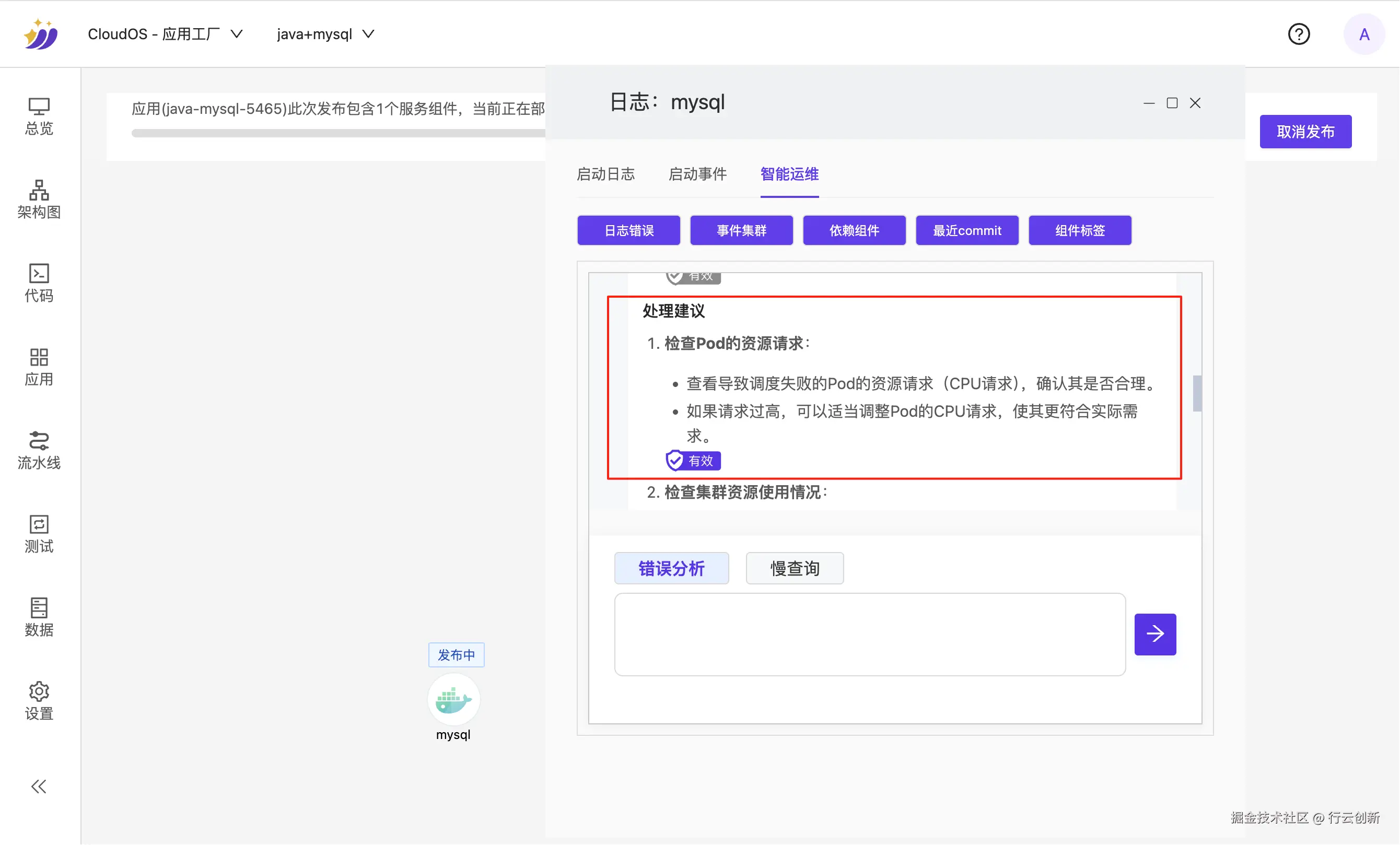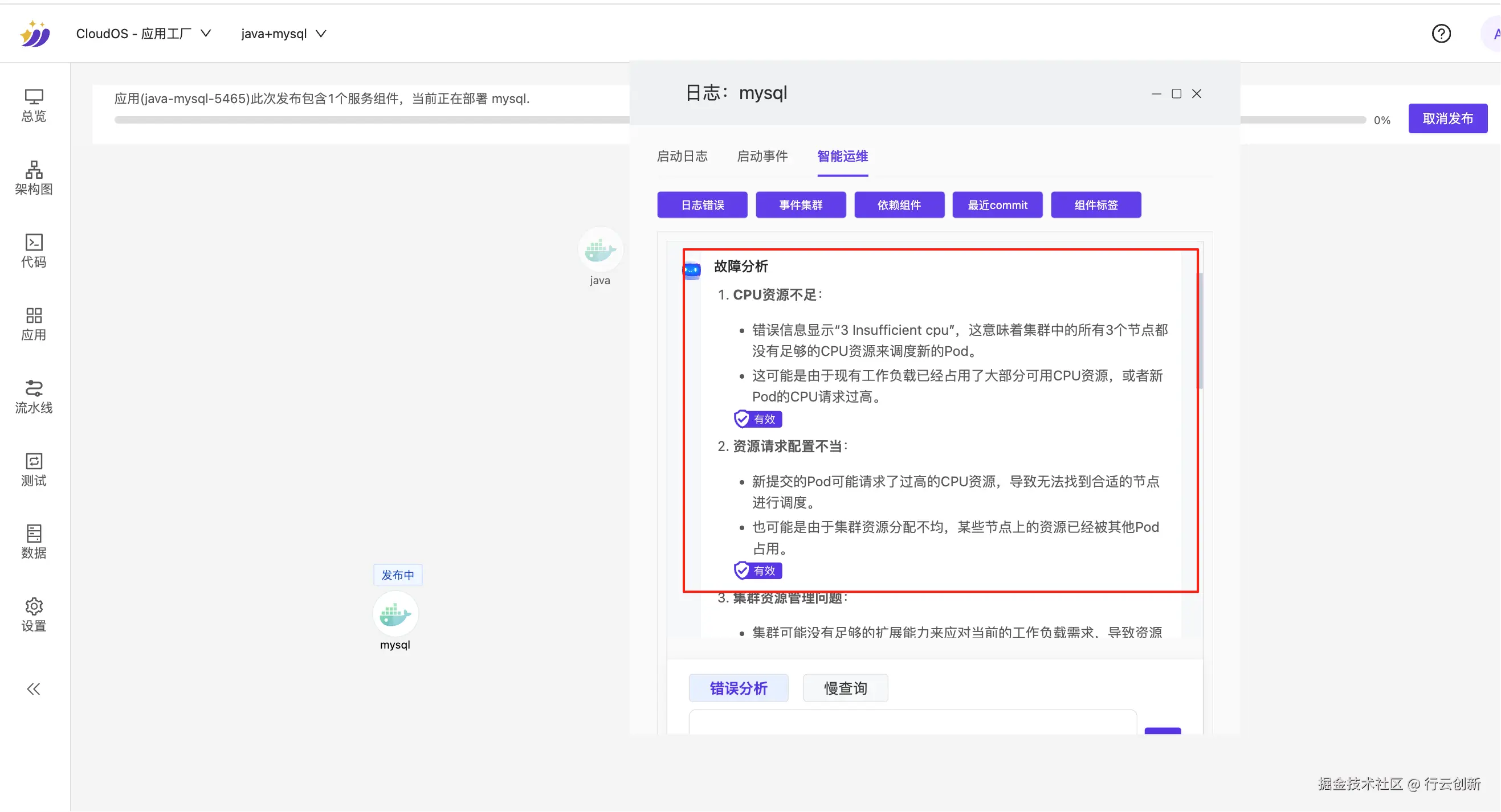 - 点击架构图右上角的「发布」按钮部署应用,进入应用管理页面查看发布进度,可发现 MySQL 发布失败;此时点击应用左上角的「智能诊断」功能,系统将自动分析失败原因并给出建议。