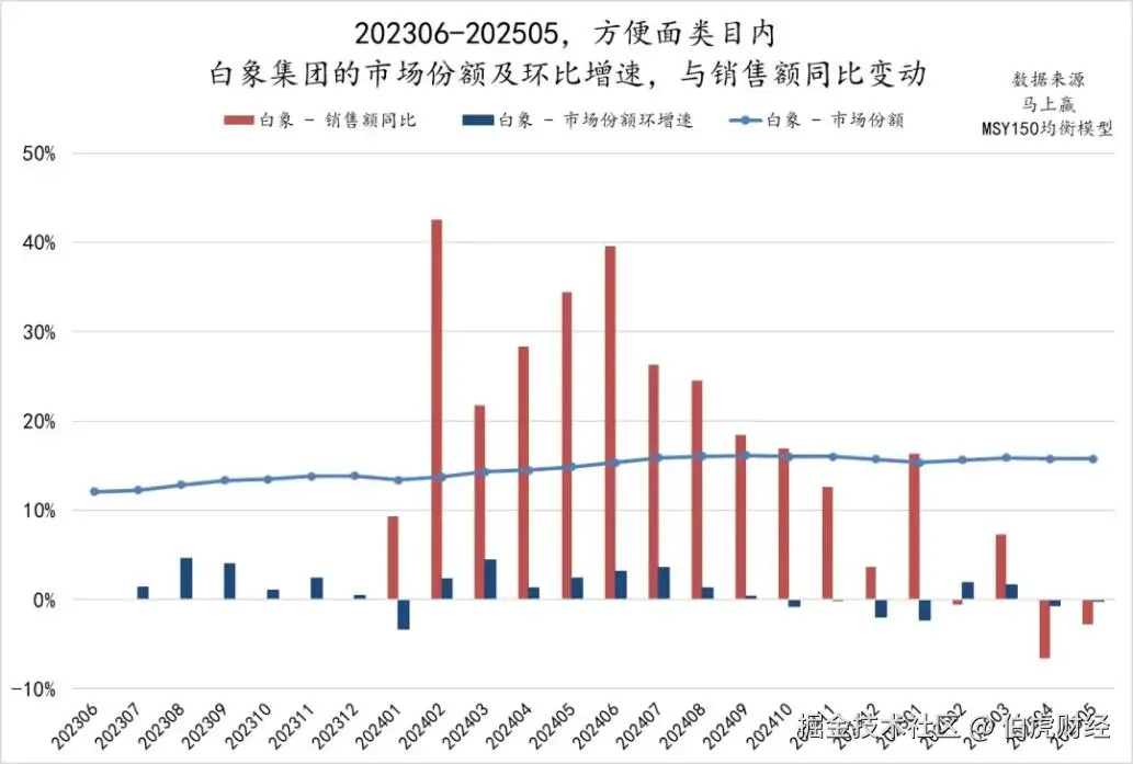 “后起之秀”白象跻身市场前三,但今年的增长势头也有所放缓。根据马上赢数据,过去两年,白象在方便面类目中的市场份额一直处于上升通道中,但从2024年下半年开始,其市场份额、销售额的增速开始放缓。