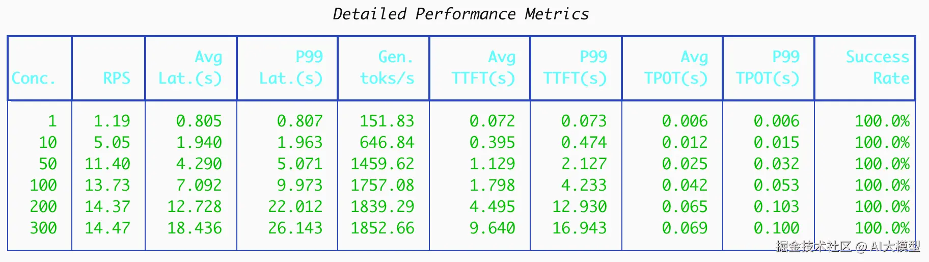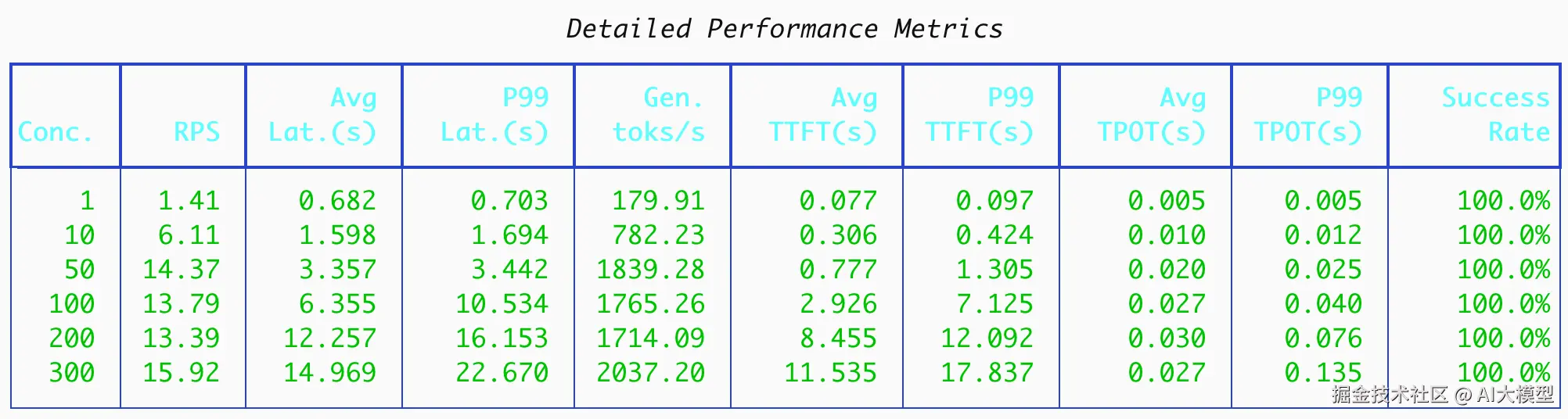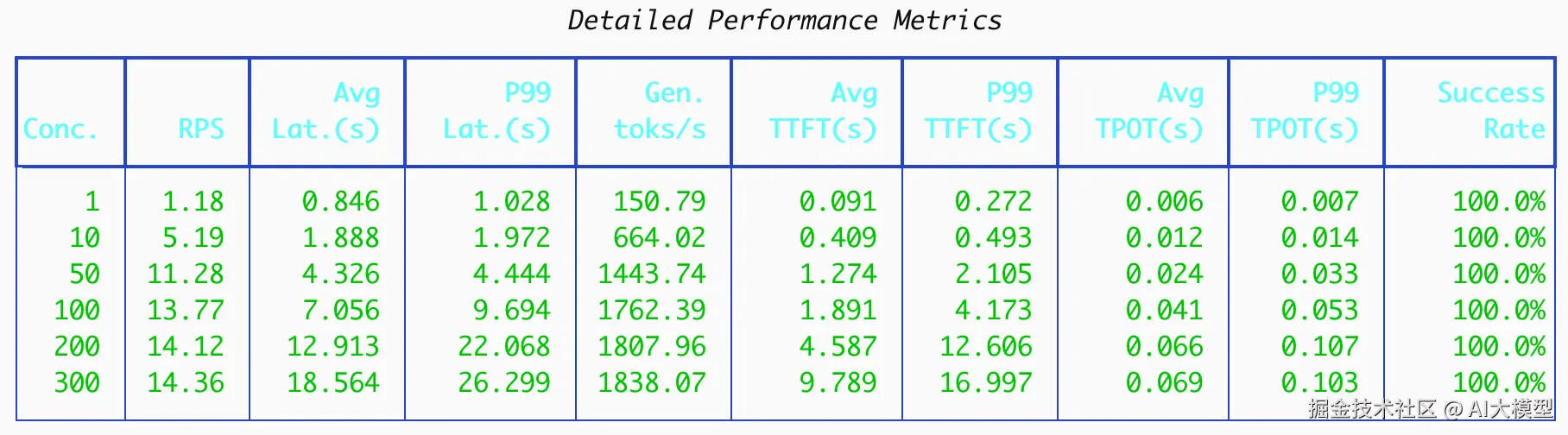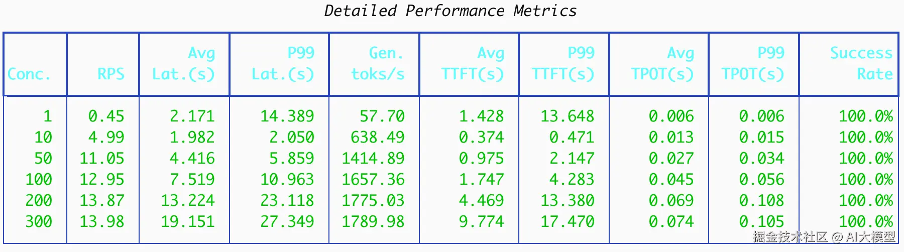 - TTFT 从 1 并发的 0.072 秒,增加到 300 并发的 9.640 秒