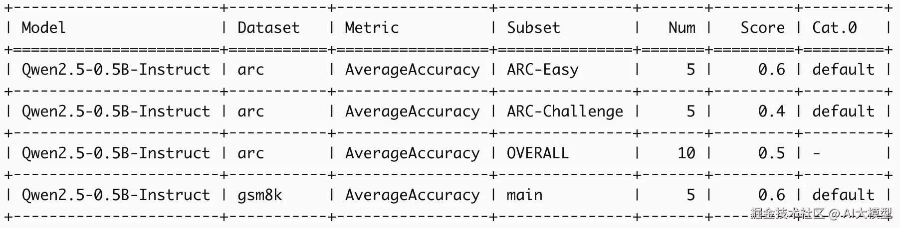 在运行示例测试命令后,便会自动下载模型与数据集,进行测试,并最终以表格的形式展示测试结果,例如: